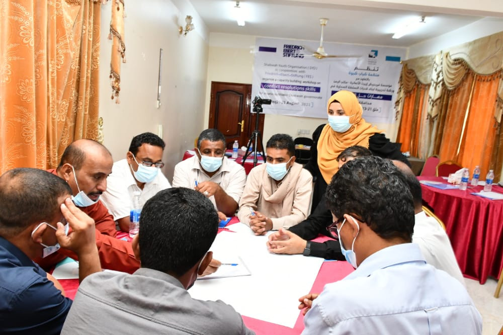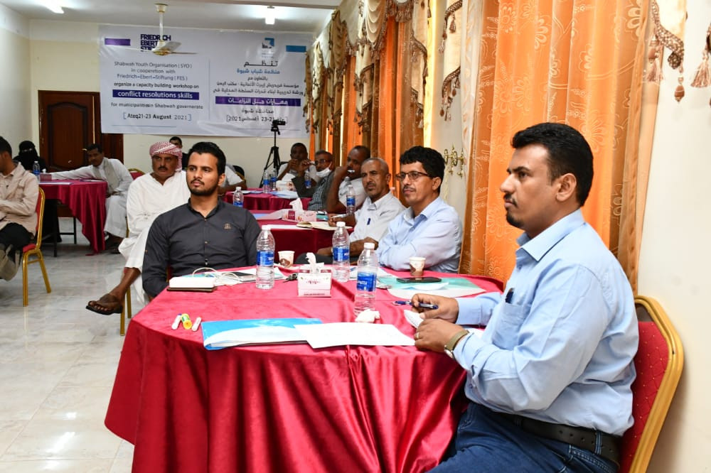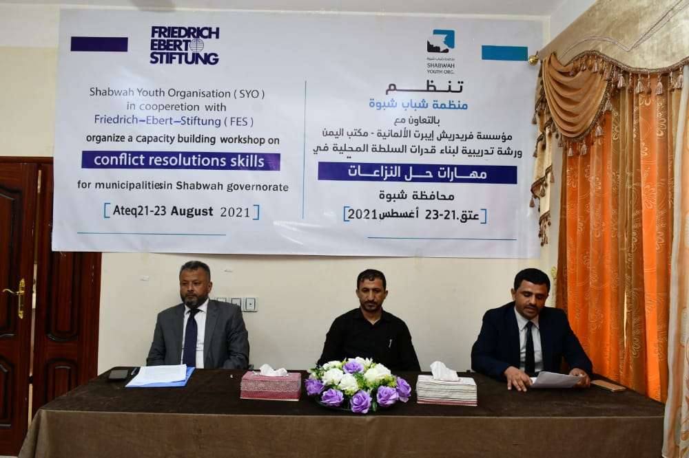 بدأت صباح اليوم ورشة تدريبية لبناء قدرات السلطة المحلية بمحافظة شبوة تنظمها منظمة شباب شبوة بالتعاون مع مؤسسة فريدريش إيبرت الألمانية. في بداية الورشة تحدث م. أحمد خيران رئيس المنظمة مرحبًا بالحاضرين معبرًا عن اعتزازه لتنفيذ هذا النشاط الذي يهدف إلى تعزيز وبناء قدرات 20 مشارك من مدراء المكاتب التنفيذية بمحافظة شبوة في مهارات حل النزاعات مؤكدًا أن برامج التأهيل والتدريب وبناء القدرات في كافة المجالات ضمن أولويات قيادة المنظمة كونها مشاريع مستدامة تسهم في بناء الإنسان وتطوير مهاراته لكونه الثروة الحقيقية والركيزة الأساسية لتطور الأوطان ورقيها وقدم شكره لمؤسسة فريدريش إيبرت ممثله بالأستاذ محمود قياح القائم بأعمال الممثل غير المقيم ومدير برامج المؤسسة على كل ما تسهم به وتوليه من اهتمامات ودعم لتنفيذ مشاريع وبرامج في مجالات مختلفة وقال محمود قياح في كلمته أن رقي الأمم وتقدمها يقاس بمدى احترامها لحقوق الإنسان وأعطى نبذة مختصرة عن المؤسسة ومجالات اهتمامها معبرًا عن أسفه لما يمر به الوطن العربي من صراعات وأكد على أهمية التدخل في حل أي نزاع قبل أن يتفاقم شريطه وأن يمتلك من يقوم بذلك التدخل المهارات اللازمة التي تمكنه من تحقيق نتائج إيجابية متمنيًا أن يتم الاستفادة من الورشة وأن تضيف مهارات جديدة إضافة إلى مهارات المشاركين وأن يكون لها أثرًا ملموسًا على الواقع العملي بما يعود بالنفع على الفرد والمجتمع. وأعرب ممثل السلطة المحلية مدير مكتب المحافظ م.محمود العمري عن شكر قيادة السلطة لمؤسسة فريدريش ومنظمة شباب شبوة على تنظيمهم لهذه الورشة والتي تأتي ضمن الخطة الاستراتيجية لقيادة المحافظة ممثلة بالأستاذ محمد صالح بن عديو الهادفة إلى تطوير وبناء قدرات أعضاء السلطة مؤكدًا الوقوف إلى جانب تلك المنظمات وتشجيعها وتسهيل كل ما يتطلب لتنفيذ برامجها. وبعدها بدأت استشارية تدريب مهارات التعامل مع النزاعات ومدربة الورشة الأستاذة سبأ البكيلي البرنامج التدريبي والذي يستمر ثلاثة أيام سيتم خلالها التعرف على الكثير من المفاهيم المتعلقة بالنزاع وأدوات تحليله ومهارات التعامل معه.