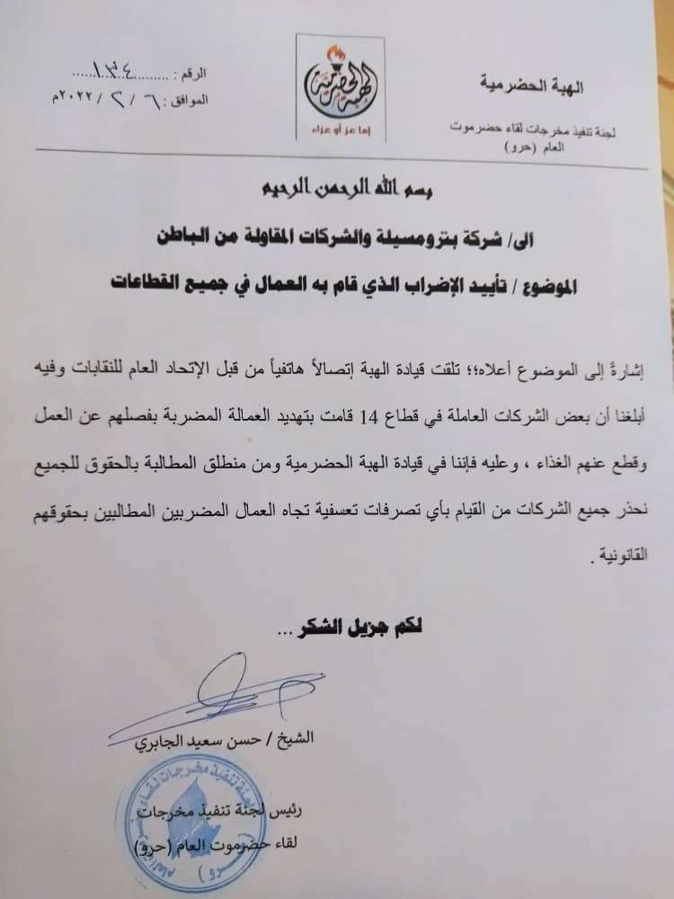 أيدت قيادة الهبة الحضرمية، اليوم الأحد 6 فبراير 2022م، الخطوات التصعيدية والاضراب الذي نفذه عمال الشركات العاملة في القطاعات النفطية التابعة لشركة بترو مسيلة، خلال رسالة رسمية بعثتها قيادة الهبة للجهات المعنية. وقالت القيادة خلال رسالتها أنها تلقت إتصالاً هاتفياً من قبل الاتحاد العام للنقابات تم إبلاغها بالتهديدات التي وصلت للعمال والتي تمثلت بالفصل وقطع الغذاء. وحذرت قيادة الهبة الحضرمية بعض الشركات العاملة في قطاع 14 من القيام بأي تصرفات تعسفية تجاه العمال المضربين المطالبين بحقوقهم. ،،