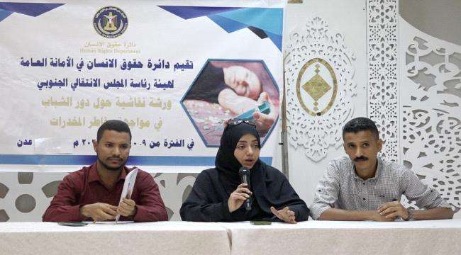 نظمت دائرة حقوق الإنسان في الأمانة العامة لهيئة رئاسة المجلس الانتقالي الجنوبي اليوم الأربعاء في العاصمة عدن ورشة نقاشية حول دور الشباب في مواجهة مخاطر المخدرات.