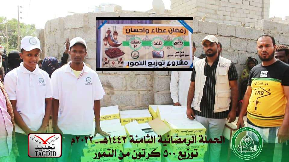 في ثاني أعمال الحملة الرمضانية الثامنة لهذا العام 1443هـ - 2022م (رمضان عطاء واحسان)، وبدعم من فاعل خير وبتنسيق الشيخ حسن المصيادي، وإشراف مباشر من القاضي فهيم الحضرمي - رئيس منظمة تجديد - والأستاذ عبدالرحمن المحضار - رئيس مؤسسة الهجرة - نفذت منظمة تجديد للتنمية بالشراكة مع مؤسسة الهجرة الخيرية للتنمية توزيع 500 كرتون من التمور، و 49 سلة غذائية، شملت عدد من المناطق بمحافظات (عدن، لحج، أبين) منها مديريات ومناطق (المنصورة، القاهرة، الشعب، دار سعد، المسمير، كرش، قعوة وغيرها من المناطق الأخرى). وتم التواصل المباشر مع مندوبي المؤسسة والمنظمة لرصد كشوفات التوزيع للأسر الفقيرة والمحتاجة في تلك المناطق، وترتيب استلامها لكراتين التمور، حيث تمت عمليات التوزيع بكل تنظيم وسلاسة، بحضور من الجانبين مندوبي المنظمة والمؤسسة ممثلة بالأستاذ أصيل البكري والأستاذ علي باحميش. يأتي ذلك بعد أن تم تدشين أعمال الحملة الرمضانية في عامها الثامن على التوالي في أوئل شهر شعبان بتوزيع 1800 كرتون من الملابس على عدد من المحافظات، وتستمر أعمال الحملة حتى آواخر شهر رمضان الكريم بتنفيذ حزمة كبيرة من الأعمال الخيرية والاجتماعية في محافظة عدن وعدد من مناطق المحافظات المجاورة. البريد الالكتروني: [email protected] أرقام التواصل المباشرة: ? 775748644 ? 733547757 حسابات المؤسسة بنك اليمن البحرين الشامل: 2501511 بالعملات الأخرى 000-215201-682-0202. بنك التسليف (كاك بنك): 1006031460. مصرف الكريمي حساب باسم (عبدالرحمن المحضار): 120052954 شركة القطيبي للصرافة: 122597721. مؤسسة الهجرة الخيرية للتنمية.. نزرع بذرة نرسم بسمة