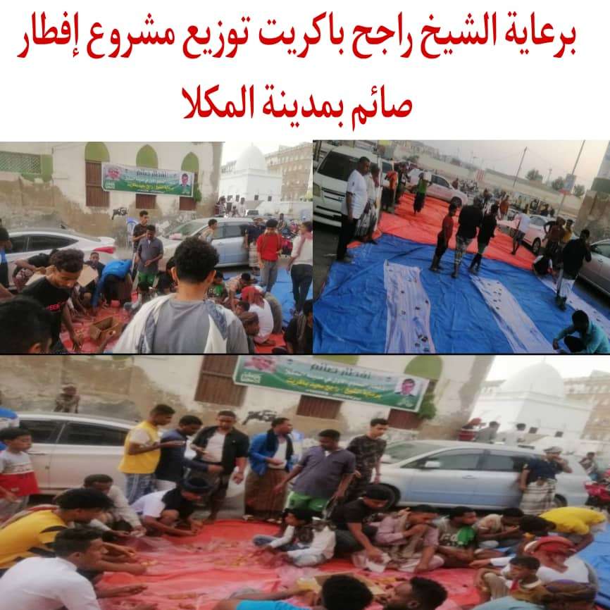 برعاية ودعم الشيخ راجح باكريت عضو مجلس الشورى نفذت الفرق التطوعية عصر اليوم مشروع توزيع إفطار صائم بمدينة المكلا بمحافظة حضرموت. هذا وينفذ مشروع توزيع إفطار صائم برعاية الشيخ راجح باكريت بعدد من المحافظات وذلك ضمن المشاريع والأنشطة الخيرية التي يتم تبناها من قبل باكريت خلال شهر رمضان المبارك. حيث لاقى مشروع توزيع إفطار صائم إشادات واسعة لكون تلك المبادرات الخيربة تخدم شريحة كبيرة من المجتمع نتيجة الظروف الاقتصادية الصعبة التي تعيشها البلاد.