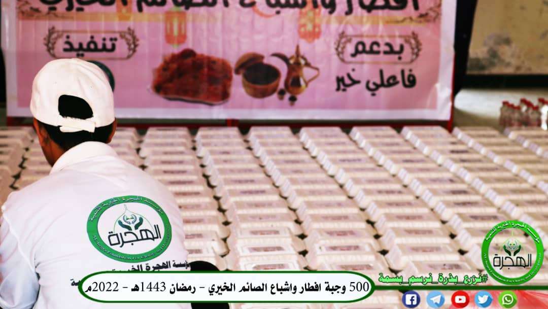 منذ أول أيام الشهر الكريم، وفي إطار حملتها الرمضانية الثامنة (رمضان عطاء وإحسان) ، من هذا العام 1443هـ - 2022م، تواصل مؤسسة الهجرة الخيرية للتنمية في العاصمة عدن، برنامجها الرمضاني المنسق بنجاح مشروع إفطار واشباع صائم الخيري لشهر رمضان الكريم، والذي يقدم يومياً اكثر من 500 وجبة إفطار محتوية على (التمر والماء والشربة والأرز والدجاج). حيث يشارك المؤسسة في توزيع تلك الوجبات الخيرية قرابة ثلاثين جهة منفذة مابين مؤسسة ومبادرة ومنتدى خيري تطوعي على مستوى جميع مديريات محافظة عدن، حسب جدول منظم أعدته إدارة المؤسسة قبيل دخول الشهر الكريم، كما تستوعب المؤسسة في توزيع الوجبات المسجلين لديها من الأسر الفقيرة والمحتاجة. وبذلك العمل الخيري الكبير تتقدم إدارة المؤسسة ممثلة برئيسها الأستاذ عبدالرحمن المحضار - بالشكر العميق لكل فاعلي الخير الذين قدموا كل ما بوسعهم لإنجاح هذا العمل الخيري الكبير الذي يسد رمق الجائعين ويفرح قلوبهم، وفي مقدمتهم منظمة تجديد للتنمية والسيد حسن البحر المحضار. أرقام التواصل المباشرة: 775748644 733547757 حسابات المؤسسة المصرفية: بنك اليمن البحرين الشامل: 2501511 بالعملات الأخرى 000-215201-682-0202 بنك التسليف (كاك بنك): 1006031460 مصرف الكريمي حساب باسم (عبدالرحمن المحضار): 120052954 شركة القطيبي للصرافة: 122597721