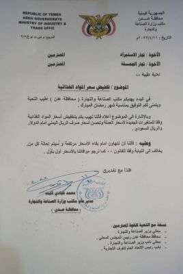 وجه مدير مكتب وزارة الصناعة والتجارة بالعاصمة المؤقتة عدن المهندس محمد عبادي تعميما هاما وعاجلا الى كبار التجار المستوردين والمنتجين وتجار الجملة بتخفيض السلع الغذائية الأساسية والاستهلاكية وفقا للمتغيرات السعرية الجديدة وتعافي العملة المحلية.