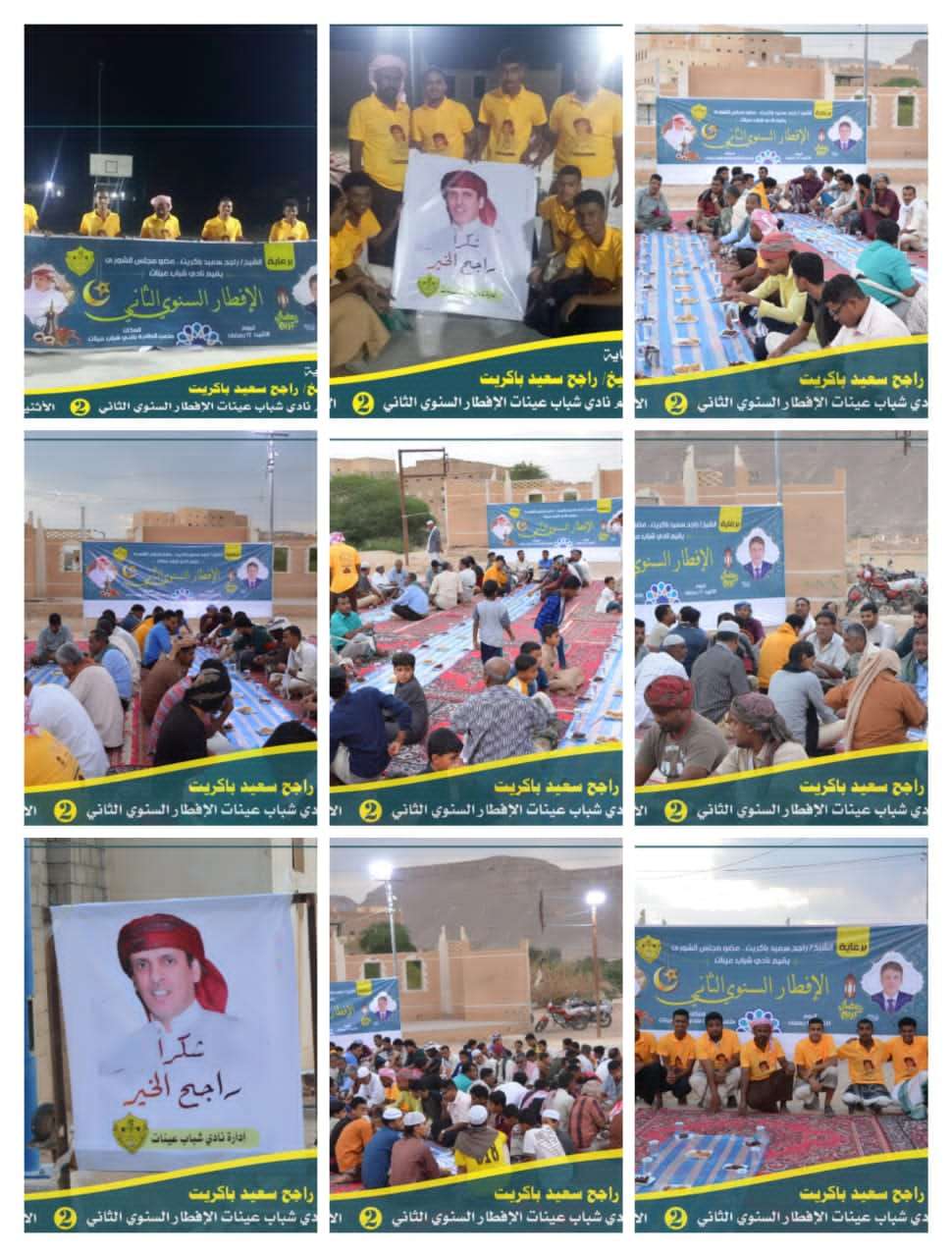 في أجواء من المحبة والالفة، أقيم مساء يوم الإثنين، السابع عشر من شهر رمضان المبارك، في الساحة العامة لنادي شباب عينات بمحافظة المهرة،الإفطار السنوي الثاني برعاية كريمة من الشيخ راجح سعيد باكريت عضو مجلس الشورى والشخصية الاجتماعية المعروفة ورجل الخير والاحسان. حيث تناول الجميع وجبة الإفطار، بعد ذلك تم الترحيب بالحاضرين من قبل الاخ هادي سعيد الرميدي رئيس النادي، مهنئا لهم بالشهر الكريم شاكرا الشيخ راجح على هذه اللفتة الكريمة للنادي وشبابه ولكل أبناء عينات. ثم تحدث الأستاذ عبدالله سالم بن سلم، ناقلا تحيات المدير العام لمكتب الشباب والرياضة بالوادي لكل الحاضرين، ومهنئا لهم بهذا الشهر الكريم، مؤكداً بالعمل على تطوير البنى التحتية لنادي شباب عينات وإيجاد موقع لمنشآت النادي وتسوير ملعبه وتعشيبه في المستقبل. بعد ذلك القيت قصيدة شعرية للشاعر عوض سعيد الرميدي مهداة للشيخ راجح باكريت بالمناسبة نالت استحسان الحاضرين.