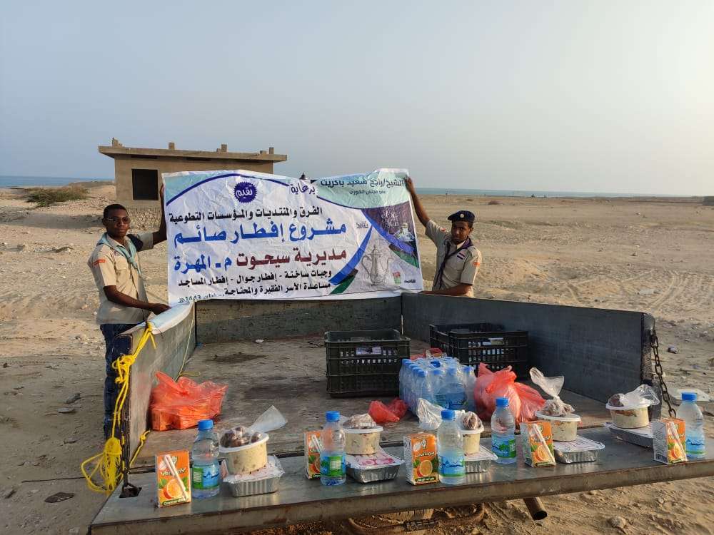 أقام المركز الكشفي بسيحوت بمحافظة المهرة، مأدبة إفطار لمجموعة من منتسبيه تكريما لمشاركتهم الفاعلة في الأعمال الرمضانية التي نفذها المركز خلال أيام شهر رمضان، والتي أتت برعاية كريمة من الشيخ راجح سعيد باكريت. وخلال اللقاء شكرت قيادة المركز اعضاءها على الجهود التي بذلت، مهنئينهم بعيد الفطر المبارك، مثمنين الدور الكبير للشيخ راجح لانجاح هذه الأنشطة والفعاليات التي لاقت ارتياح كبير في الاوساط الشعبية، متمنين أن تستمر تلك الجهود في قادم الأيام.