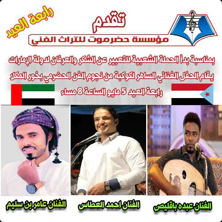 وجه رئيس الحملة الشعبية لشكر دولة الإمارات في حضرموت، الصحفي محمد عبدالله بوعيران، دعوة لأبناء حضرموت للمشاركة في الحفل الجماهيري الغنائي في ساحة خور المكلا مساء غدا الخميس . وقال الصحفي بوعيران في منشور له على موقع التواصل الإجتماعي "فيسبوك" أن الحملة الشعبيه لشكر دولة الإمارات في حضرموت ستقيم غدا الخميس الموافق 5/ 5 /2022م حفل جماهيري غنائي في ساحة خور المكلا الساعة 8 مساء . مشيرا بأن الحفل سيشهد إطلاق الألعاب نارية، وكشف الستار عن عمل فني جديد يعرض لأول مرة، وذلك احتفالاََ بذكرى 24 من أبريل العظيمة معركة العزة والكرامة. الجدير بالذكر أن حفل الغد ختاما لفعاليات الحملة الشعبية لشكر دولة الإمارات لهذا العام، حيث شيّدت في مدن ساحل حضرموت لوحات شكر عملاقة لدور الاشقاء في دولة الإمارات، كتعبير شعبي ورسمي عن فرحة أبناء حضرموت بهذه الذكرى، ولدور دولة الإمارات في تجهيز ودعم جيش النخبة الحضرمية .