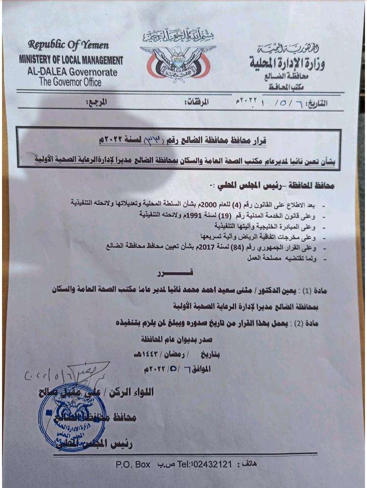 محافظ الضالع يُعيّن الدكتور مثنى سعيد نائباً لمدير عام مكتب الصحة بالمحافظة مدير لإدارة الرعاية الصحية الأولية.