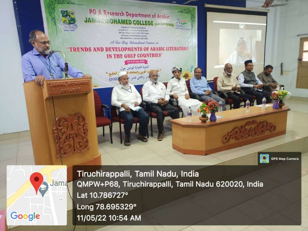 اقام قسم اللغة العربية للدراسات العليا بكلية جمال محمد في جنوب الهند ندوةً دولية بعنوان "تطور الأدب العربي واتجاهاته في بلدان الخليج"، وذلك في اليومين الحادي عشر والثاني عشر من شهر مايو لعام 2022م تحت زعامة رئيسه الدكتور عبد القادر. وفي الحفلة الافتتاحية للندوة، ألقى عميد الكلية الدكتور محمد إسماعيل محي الدين خطابه الرئيسي حيث أوضح بشكل واضح حول التعاون الذي قدمته إدارة الكلية لتطوير قسم اللغة العربية وتعزيز آدابها. وأعرب عن أمله في أن الندوة ستمهد الطريق لبناء فهم أفضل . و شارك في الندوة جهابذة الأدب العربي وكبار الأستاذة والباحثين من مختلف المعاهد التعليمية من المملكة العربية السعودية واليمن وعمان وقطر والمغرب وسريلانكا خارج الهند ومن ولاية كيرالا والبنغال الغربية وخارج تامل نادو. وكان في مقدمتهم فضيلة الأستاذ ياسر مدخلي، مؤسس مسرح كيف ورئيس تحرير فصلية المحترف من المملكة العربية السعودية حيث ألقى كلماته الرئيسية وسلط الضوء على نشأة مسرحيات عربية وتطورها واتّجاهاتها في بلدان الخليج العربي عموما وفي المملكة العربية السعودية خصوصا. وفضيلة الأستاذ بسّام أحمد الغفوري من جامعة الحديدة باليمن ألقى كلماته الافتتاحية وبيّن فيها أهمية إقامة مثل هذه الندوات . وفضيلة الأستاذ د. عبد الحق بالعابد، أستاذ نظرية الأدب والأدب المقارن، بجامعة قطر، قد ترأس جلسة تقنية حيث تقدم الأساتذة مداخلاتهم البحثية فيها، وأضاف الأستاذ تعليقاته القيمة على تلك المداخلات. فيما قدّمت الأستاذة د. بلقيس أحمد الكبسي من مركز البحوث باليمن مداخلتها البحثية على موضوع "التقنيات السردية في الشعر المعاصر الشاعر عبد العزيز المقالح أنموذجاً". وقد شارك فيها كثير من الأستاذة الكبار ورؤساء الأقسام من جامعات مختلفة، ومنهم فضيلة الأستاذ د. ذاكر حسين، الأستاذ المشارك، قسم اللغة العربية والفارسية والأردية بجامعة مدراس، تشنائي، وفضيلة الأستاذ د. أحمد إبراهيم، رئيس قسم اللغة العربية للماجستير والبحوث بالكلية الجديدة التابعة لجامعة مدراس، تشنائي، وفضيلة الأستاذ د. محي الدين كتي، رئيس قسم اللغة العربية بجامعة كالكوت، كيرالا، وفضيلة الأستاذ د. صابر نواس، مدير، أكاديمية التمييز، كاليكوت، كيرلا. وقد تمّ تقديم واحدة وأربعين مداخلة في ستّ جلسات. وفي الجلسة النهائية للندوة تم توقيع مذكرة التفاهم بين كل من كلية جمال محمد، ومثّلها سكرتير الكلية د. خواجه نجم الدين، وأكاديمية التمييز كاليكوت، كيرلا ممثله بمديرها د. صابر نواس. وختام الندوة تم توزيع الشهادات للمشاركين تقديراً لجهودهم ومشاركتهم . الجدير بالذكر إن كلية جمال محمد من أشهر الكليات بجنوب الهند ، التابعة لجامعة بهاراتيداسان، تيروتشيرابالي في ولاية تامل نادو، الهند. وتم تأُسيسها سنة 1951م، وتقع في الجزء الأوسط من ولاية تامل نادو. وهي مؤسسة أقلية دينية، تستهدف إلى توفير التعليم العالي للفئات المضطهدة والمتخلفة اجتماعياً في المجتمع بشكل عام والأقلية المسلمة بشكل خاص ، ويدرس فيها الآن حوالي إثني عشر ألف طالب وطالبة كما يقوم بالتدريس أكثر من خمس مائة أستاذ وأستاذة في ثمانية وعشرين منهجاً دراسياً من العلوم والفنون ، ويلعب قسم اللغة العربية دوراً هاماً في نشر اللغة العربية وآدابها وفنونها منذ تاريخ تأسيس الكلية.
