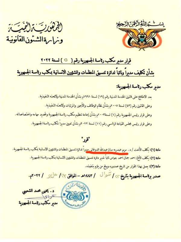 نجحت مليشيا إيران في اليمن، اختراق المجلس الرئاسي، بقرار رسمي تمثل في إصدار مدير مكتب الدكتور رشاد العليمي رئيس المجلس الرئاسي، قرار قضى بتعيين ناشطة حوثية في مكتب الرئاسة. جاء ذلك في وثيقة رسمية، أصدر مكتب العليمي قرار بتعيين المدعوة د.مريم عبدربه سالم عبدالله الدوغاني، مديرا لدائرة تنسيق المنظمات والشئون الإنسانية بمكتب رئاسة الجمهورية، بالإضافة لتعيين قيادي إخواني نائبا لها. تعيين الدوغاني فجر غضب شديد في الشارع اليمني، الذي أظهر تورط الناشطة، مع مليشيا الحوثي المصنفة إرهابية. وقبل أكثر من سنة، تم نشر خبر، أشاد فيه مدير عام مديرية الحالي في محافظة الحديدة الخاضعة لسيطرة المتمردين الحوثيين حالياً، بجهود مريم الدوغاني، التي عينها رئيس المجلس الرئاسي في مكتبه. كما ورد في الخبر الذي أعاد اليمنيين الغاضبين نشره اليوم بعد مرور عام عليه، اسم الدكتورة مريم بصفتها رئيس منظمة رعاية الأطفال في مناطق سيطرة مليشيات الحوثي، وهو ما اعتبره سياسيون ونشطاء فضيحة جديدة للتعيينات من مكتب الرئاسة. وتعليقا على قرار مريم، قال الصحفي محمود العتمي، أن رشاد العليمي يختار موظفي رئاسة الجمهوريه اما حوثه من صنعاء أو اخوان من تركيا. وأوضح العتمي في تدوينة نشرها على حسابه الرسمي بموقع فيس بوك رصدها نافذة اليمن أن :"مريم الدوغاني لقبل كم يوم وهي تناشد بوقف معركة تحرير الحديدة ولم نشهد لها تصريح يحمل الحوثيين مأساة أطفال تهامة الذي تتربص ألغام الحوثي بهم وقتلت العشرات منهم ،و احمد جواس من غلمان المرشد جالس عاده في انقره لليوم". واعتبر د.عبدالقادر الخراز هذا التعيين، نكبة وفضيحة كبيرة، إذ قال: "مجلس الرئاسة يعين حوثية رئيسة لدائرة تنسيق المنظمات بالرئاسة، وهي مديرة منظمة محلية في مناطق الحوثي". كما اضاف أن :"الحوثة في الحديدة بشيدوا بها، مستدلا بخبر نشر في المواقع الإخبارية حيث يشيد بها مدير عام مديرية تقع تحت سيطرة الحوثي". وفي سياق متصل، انتقد الصحفي والمحلل السياسي ياسر اليافعي هذا التعيين، مشيراً إلى أنه إعادة إنتاج للادوات التي خرجت من باب هادي. وذكر اليافعي في تدوينة نشرها على حسابه الرسمي بموقع فيس بوك :"خرجوا من باب هادي ورجعوا من شباك يحيى الشعيبي!، تعيينات اخوانية تهدد بنسف التوافقات وعودة الأوضاع الى ما كانت عليه في قبل مشاورات الرياض". كما اضاف : "الناس كانت تنتظر تغيير وزير الدفاع ووزير الداخلية والاستعداد لمواجهة الحوثي لكن صار هم العليمي والشعيبي عودة الدولة القديمة وتحالف 1994 بشكل آخر ..دائماً ما يلتفون على التوافقات ويفشلونها وكأنهم لا يتعلمون من دروس الماضي". وتابع اليافعي : "يعينون شمالي اخواني ونائب له اخواني من الجنوب ويقولون مناصفة عقلية الاخوان تتحكم بالمشهد..الناس لن تصمت على الاخطاء".