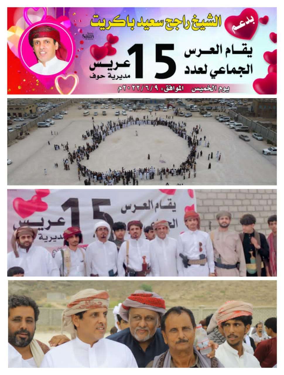 أُقيم يوم الخميس، بمديرية حوف بمحافظة المهرة، عرساً جماعياً لـ15 عريس من أبناء المديرية. وجاءت تلك المبادرة نتيجة للظروف التي يمر بها الكثير من الشباب، وصعوبة بلوغ الزواج نتيجة لتدهور الوضع الاقتصادي والمعيشي في البلاد، لاسيما الغلاء الفاحش في مهور الزواج. حيث شهد حفل العرس فقرات متنوعة ورقصات شعبية، تم تقديم وجبة عشاء للحاضرين. الجدير ذكره أن العرس الجماعي الذي أُقيم برعاية ودعم الشيخ راجح سعيد باكريت، الشخصية الاجتماعية والقبلية التي تحظى بشعبية واسعة بين أبناء المهرة، كما أنه قد رعى العديد من الأنشطة والفعاليات التي أقيمت في المحافظة