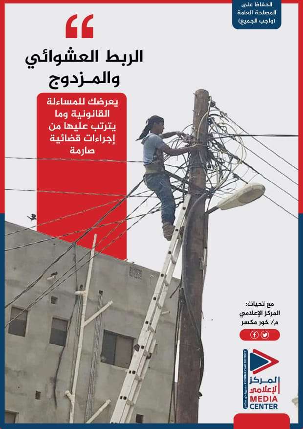قال مدير عام مديرية خورمكسر، عواس الزهري، إن الربط العشوائي للتيار الكهربائي كان له الأثر البارز في إضعاف الإنتاج العام للكهرباء، مقارنة بزيادة الأحمال خلال فصل الصيف الحالي.. مشيرا إلى أن فاقد التيار الكهربائي بسبب الربط العشوائي بلغ أكثر من 50% من إجمالي الناتج للتيار الكهربائي، وفق تقارير مؤسسة الكهرباء، الأمر الذي انعكس سلباً على الخدمة بازدياد ساعات انقطاع التيار الكهربائي مما فاقم من معاناة الناس بسبب موجة الحر الشديد الحالية. وحث الزهري أئمة وخطباء مساجد المديرية على الاضطلاع بدورهم الديني والوطني في توعية وإرشاد سكان المديرية فيما يخص ظاهرة الربط العشوائي والمزدوج للتيار الكهربائي.. مشددا عليهم بضرورة توعية الناس بالضرر المجتمعي الناتج عن هذه الظاهرة، وأنه يجب التوضيح للناس أن الربط غير الرسمي للتيار الكهربائي يعتبر ظاهرة سلبية يجرم صاحبها شرعا وقانونا، ولابد مكافحتها من أجل المصلحة العامة.. مؤكدا أنها تسبب مؤخرا بتلف الكثير من محولات الكهرباء، ناهيك عن ما تسببه من مخاطر الحرائق بسبب الالتماس الكهربائي. وقال الزهري إن مسؤولية الحفاظ على خدمة الكهرباء تقع على عاتق الجميع، ولابد من تضافر الجهود لمحاربة ظاهرة الربط العشوائي للتيار الكهربائي والقضاء عليها. وأوضح أن السلطة المحلية بخورمكسر تنفذ حالياً حملة لفصل الربط العشوائي والمزدوج للكهرباء في المديرية، بالتنسيق مع مؤسسة الكهرباء.. مشيرا إلى ضرورة تعاون كل أبناء المديرية لإنجاح الحملة، وأنه يجب عدم التهاون مع هذه الظاهرة المستنزفة للطاقة الكهربائية، والتي بات ضررها واضحاً في الانهيار المتسارع لمنظومة الكهرباء في العاصمة عدن بشكل عام.