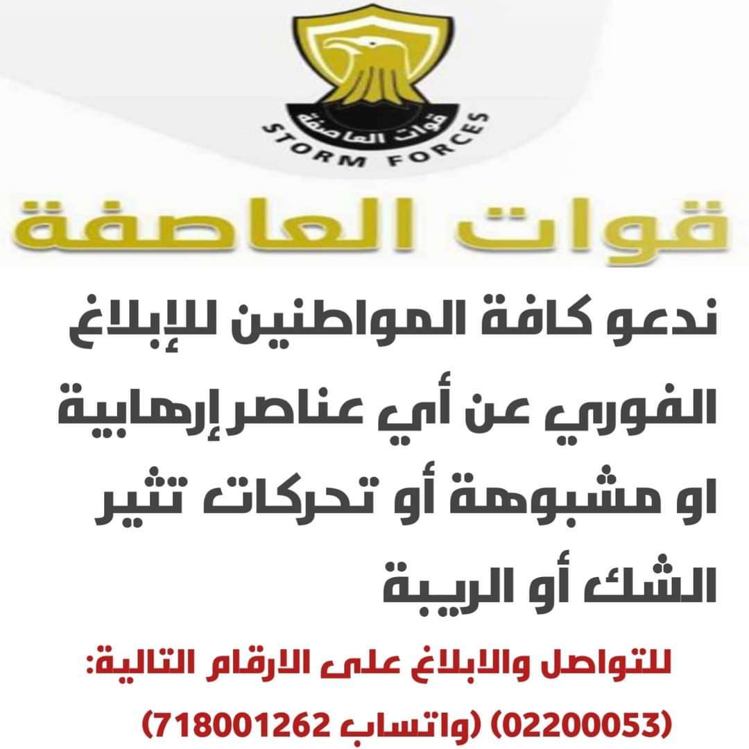 تكثف الأجهزة الأمنية في العاصمة عدن متابعاتها لإحباط مخططات التنظيمات الإرهابية والقوى المتطرفة التي تقوم بنشر الخوف وازهاق أرواح الأبرياء واستهداف القيادات السياسية والعسكرية الجنوبية من خلال إستخدام العبوات المتفجرة والسيارات المفخخة . إن أجهزته الأمنية لم ولن تثنيها هذه الأعمال الإرهابية الجبانة عن مواجهة عناصر الشر والإرهاب وحفظ الأمن والاستقرار وحماية المواطنين بمختلف جنسياتهم وانتماءاتهم. وبهذا تناشد قوات العاصفة كافة المواطنين في العاصمة عدن التعاون مع الأجهزة الأمنية وكذلك الدوريات المتحركة التي تنفذ عملية إنتشار واسعة يومياً في مديريات العاصمة عدن لتتبع وملاحقة تلك العناصر التى تستهدف النيل من المواطنين وتهدد أمنهم وأمانهم ... وذلك من خلال الإبلاغ الفورى عن أي معلومات أو عناصر محل إشتباه أو تحركات تثير الشك أو الريبة والإبلاغ عن الغرباء فى محيط سكنهم. للتواصل والابلاغ على الرقم التالي: (اتصال 02200053) (واتساب 718001626) حما الله العاصمة عدن ووقاها شر الفتن
