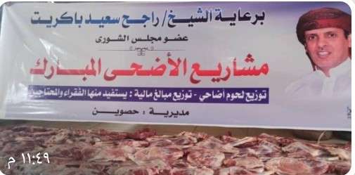 دشنت لجنة المساعدات الإنسانية بمحافظة المهرة، اليوم، مشروع توزيع اللحوم للأسر الفقيرة والمحتاجة في عموم مناطق مديريات المحافظة تحت رعاية الشيخ راجح باكريت عضو مجلس الشورى محافظ المهرة الاسبق. ويحتوي المشروع على لحوم متنوعة من الإبل والبقر والأغنام والماعز ، ويستفيد نحو 1500 أسرة من أبناء محافظة المهرة وفي عموم مديرياتها. كما دشنت لجنة المساعدات الإنسانية أيضاً مبالغ مالية وهدايا مقدمة من الشيخ راجح باكريت مخصصة للأطفال الأيتام واستفاد منها أكثر من 1300 طفل. تجدر الإشارة إلى الشيخ باكريت يقوم بتنفيذ مشاريع إنسانية وأنشطة تطوعية وخيرية مختلفة يستفيد منها أبناء محافظة المهرة والمقيمين فيها.
