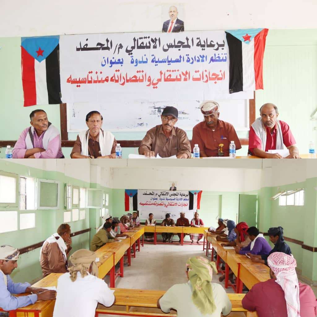 إنجازات الانتقالي وانتصاراته منذُ تأسيسه.. ندوة عمل لسياسية انتقالي المحفد في أبين.
