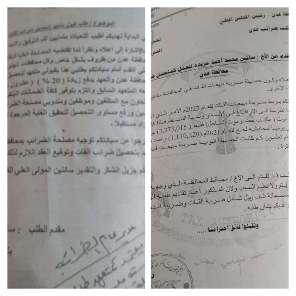 قال الشيخ سالمين محمد مزيدة، أن وزير الدولة المحافظ لملس أصدر توجيهات سابقة بتكليفي محصل لضرائب القات بالعاصمة عدن، ومنتظر فترة انتهاء محصل مهلة المحصل القديم إلا أنني تفاجأت بوجود شخص آخر. نص المناشدة: بناء على التوجيهات السابقة من قبلكم للشيخ سالمين محمد مزيدة كمحصل لضريية القات بتاريخ 2021/6/27 والتكليف من قبل مصلحة الضرائب 2022/3/27 وتعهد بدفع مبلغ وقدره 7500000 سبعة مليون وخمس مائة ألف ريال يمني يوميا، فقد بلغ محصل لحج لعام 2021مبلق وقدره و1110220مليون ومائه وعشره الف ومائتين وعشرون ريال وفقا الاحصائيات في الوثيقة المرفقة وكذالك يورد في محافظه حضرموت الساحل التي تورد «3373010»يوميا لعام 2021 ورقم من التوجيهات الصريحة له بذلك، وفوق هذا وكله وجدنا هناك توجيهات بتكليف صالح جابر كمحصل لضريبه القات محافظه عدن باسم أخيه برغم أن الاخ صالح جابر محصل لمحافظة لحج لضريبة القات، وكون الاخ سالمين محمد مزيدة مقدم الطلب إلى الاخ محافظ المحافظة الذي أعطى باعتماده كمحصل لضرائب القات، ولكن إلى الان لم يتم ذلك ولا نعرف ما هو السبب. فمن هنا نناشد وزير الدولة الاخ الأستاذ حامد لملس النظر في الموضوع وأخذ الموضوع بعين الاعتبار، كيف يكون هناك تكليف جديد فوق التكليف السابق، وهذا يؤدي إلى مشكلة بانت بوادرها لأطراف لاتريد الخير للعاصمة عدن وعرقلة جهود المحافظ الرامية الى زيادة الدخل للمحافظة، ونحن كلنا ثقة وأمل في التماس العدالة التي طالما عهدناها من سيادتكم.