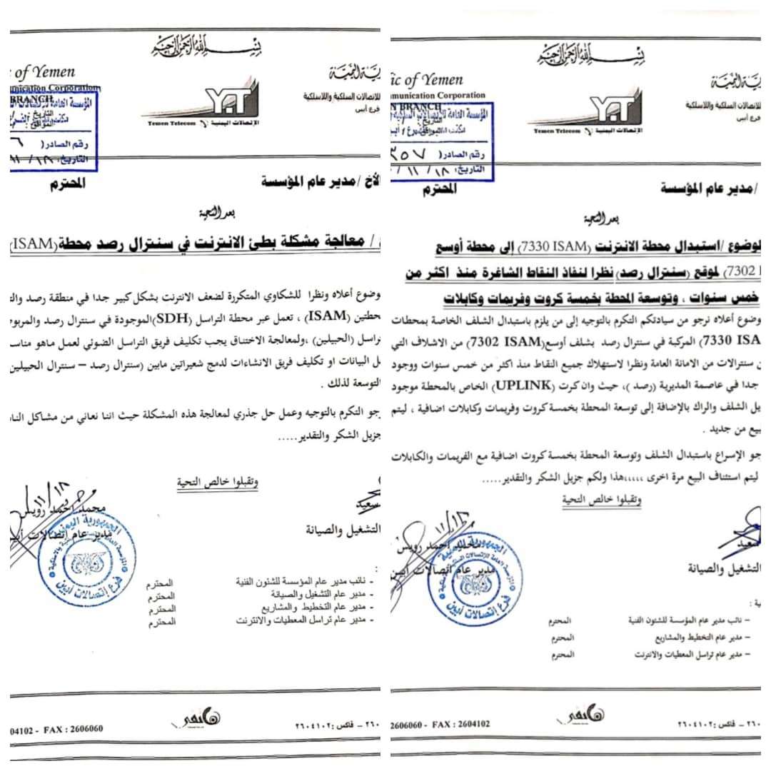 قدم الشيخ/ ياسر عبدالله العمودي مدير عام مديرية يافع رصد الشكر والتقدير لكلا من المهندس محمد أحمد رويس مدير عام اتصالات م/ابين والمهندس مختار عبدالله احمد مدير مركز اتصالات رصد وجميع المهندسين والفنيين العاملين في مجال الاتصالات على كل الجهود الذي بذلوها من أجل حل مشكلة ضعف وردائه الانترنت في سنترال رصد الذي كان يشكو منها المواطنين منذوا سنوات والتي وصلت خلال الأعياد والمناسبات الى الانقطاع الكلي. حيث قام المهندسين بتركيب محطة بسعة تراسلية أكبر لحل مشكلة الانترنت في مركز مديرية رصد وكذالك التجهيز لإيصال الخدمة إلى بقية المناطق عبر سنترال رصد. هذا وسبق أن وجه المهندس محمد الرويس مذكرتين إلى مدير عام المؤسسة العامة للاتصالات وكان مضمون المذكرة الاولى معالجة بطئ الانترنت في سنترال رصد الذي يشتغل عبر محطتين ( ISAM ) وتعمل عبر محطة التراسل ( SDH ) الموجودة في سنترال رصد والمربوطه عبر محطة التراسل في مديرية الحبيلين والعمل بما هو مناسب لرفع سرعة نقل البيانات وإيجاد حل جذري لهذه المشكلة. أما المذكرة الاخرى طالب فيها باستبدال محطة الانترنت لموقع سنترال رصد ( ISAM 7330 ) إلى محطة أوسع ( ISAM 7302 ) نظرا لنفاذ النقاط الشاغرة منذوا أكثر من خمس سنوات ، حيث أن كرت ( UPLINK ) الخاص بالمحطه موجود ويتم فقط تبديل الشلف والراك بالإضافة إلى توسعة المحطة بخمسة كروت وفريمات وكابلات اضافيه ، وذلك بسبب وجود طلبات كثيره على نقاط الانترنت من قبل المواطنين في مديرية يافع رصد والعمل على استئناف بيع نقاط الانترنت مره اخرى.