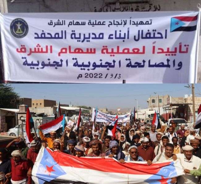 إستجابة لعملية "سهام الشرق" التي أطلقها الرئيس القائد/عيدروس قاسم الزُبيدي، رئيس المجلس الانتقالي الجنوبي، القائد الاعلى للقوات المسلحة الجنوبية، خرج المئات صباح اليوم السبت في مديرية المحفد بأبين بمسيرة ومهرجان جماهيري حاشد تأييداً لعملية سهام الشرق لتأمين مديريات محافظة أبين وفرض الأمن والاستقرار في ربوع مديريات المحافظة، ومباركةً لتوحيد الصف الجنوبي بين قيادات المحافظة وكان في مقدمة الفعالية الكبرى التي انطلقت صباح اليوم السبت والتي طافت الشارع العام لمدينة المحفد قيادتي المجلس الانتقالي والمقاومة الجنوبية وعدداً كبير من الشخصيات العسكرية والمدنية ومنظمات المجتمع المدني بالمديرية هذا وردد المتظاهرون في الفعالية التي شهدتها مدينة المحفد الشعارات التي تؤكد تأييد أبناء المديرية لعملية سهام الشرق،والوقوف التام إلى جانب قواتنا المسلحة الجنوبية في فرض الأمن والاستقرار وتأمين مديريات المحافظة، ومباركةً لتوحيد الصف الجنوبي لتجسيد مبدأ التصالح والتسامح، رافعين صور الرئيس القائد الزُبيدي، ولافتات تعبّر عن هذه المناسبة العظيمة على قلوبهم وبدأ المهرجان الجماهيري الحاشد بآيه من الذكر الحكيم القاها الشيخ/عمر عبدربه باعزب مدير إدارة الوعظ والإرشاد الديني، ثم الاستماع إلى النشيد الوطني الجنوبي، ثم وقفة حداد على روح شهداء الجنوب وألقى رئيس الهيئة التنفيذية للمجلس الانتقالي الجنوبي بالمديرية الاستاذ/عوض علي صائل، كلمة رحب من خلالها بالحاضرين في هذه الفعالية وبكل الضيوف المشاركين فيها، شاكراً الجماهير الحاشدة التي توافدت من كل حدباً وصوب من مناطق وقرى ومراكز المديرية في تأييدهم لعملية سهام الشرق ،ومباركتهم للتلاحم الجنوبي بين القيادات العسكرية والأمنية في أبين التي تجسّد روح المبادئ الوطنية والتصالح والتسامح الجنوبي.