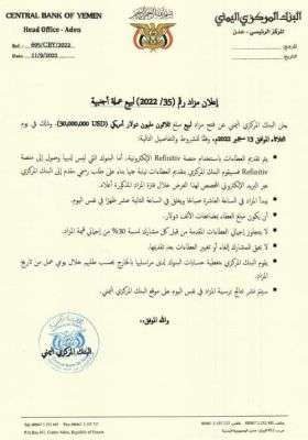 يعلن البنك المركزي اليمني عن فتح مزاد لبيع مبلغ ثلاثون مليون دولار أمريكي (30,000,000 USD)، وذلك في يوم الثلاثاء الموافق 13 سبتمبر 2022م، وفقًا للشروط والتفاصيل التالية: