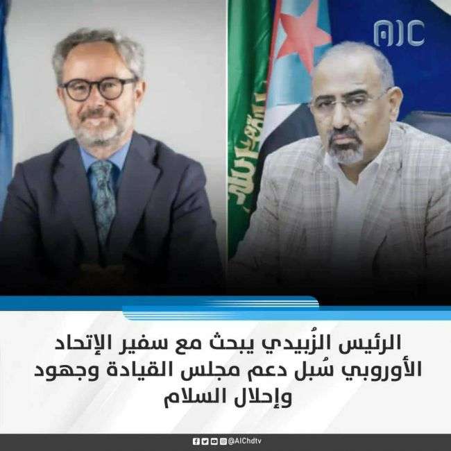 بحث الرئيس القائد عيدروس قاسم الزُبيدي رئيس المجلس الانتقالي الجنوبي، نائب رئيس مجلس القيادة الرئاسي، سُبل دعم دول الإتحاد الأوروبي لمجلس القيادة الرئاسي، وجهود الأمم المتحدة لإحلال السلام في اليمن.