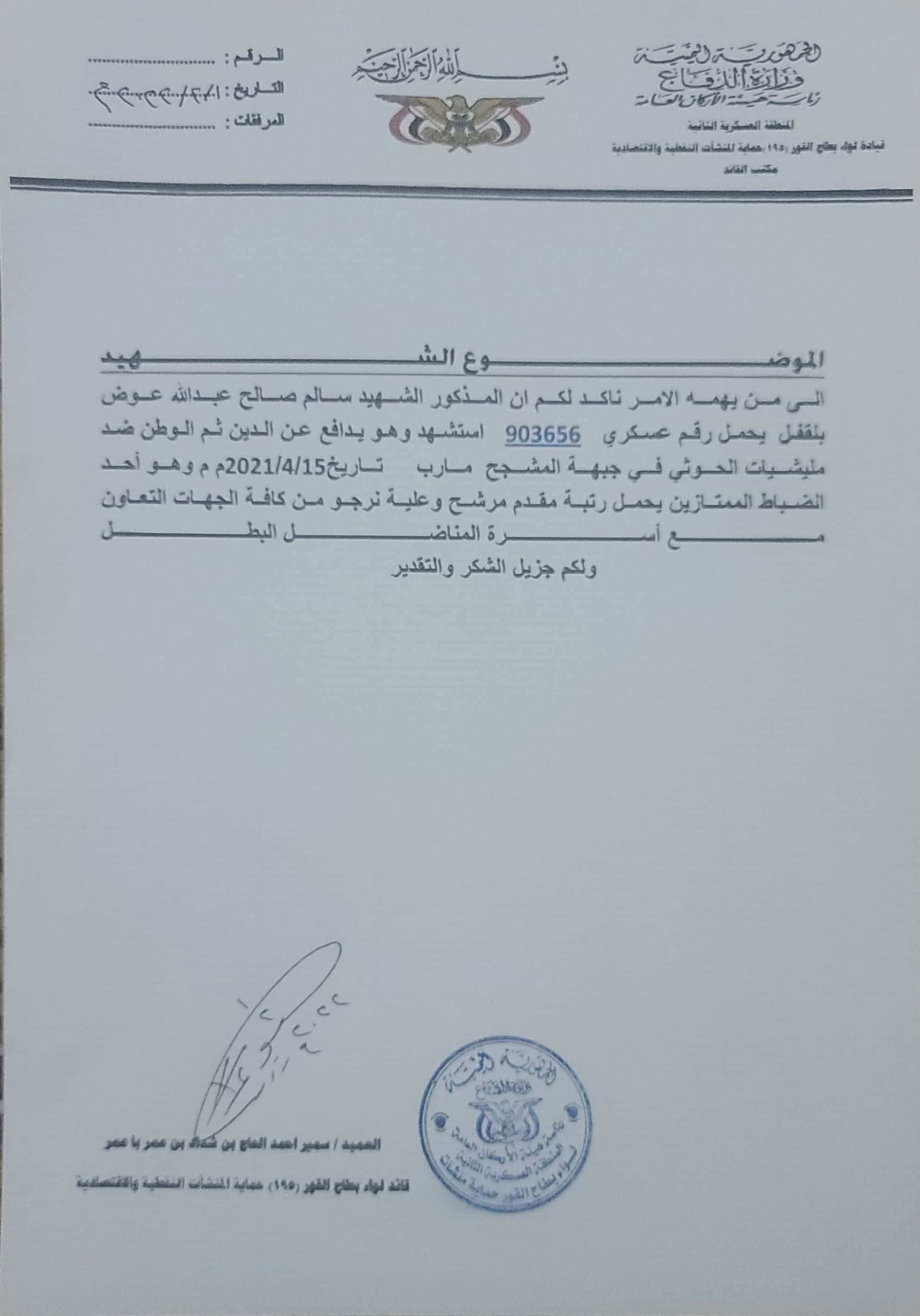 تقدمت اسرة الشهيدالمقدم سالم صالح عبدالله بلقفل الملقب ابوالتراب بمناشدة عاجلة للاخوة رئيس واعضا مجلس القيادة الرئاسي حول صرف جميع مرتبات والدهم الشهيد التي يستلمها قائد اللؤ الثالث حزم منذ استشهاد والدهم بجبهة مارب بشهرابريل لعام2021م الئ يومناء هذاء دون اي مسوق قانوني لذلك نص المناشدة! ! الاخوة رئيس واعضا مجلس القيادة الرئاسي المحترمون جميعا" نتقدم اليكم بمناشدتنا ومظلوميتنا هذه لااعادة النظــر في صرف مرتبات والدنا الشهيد سالم صالح عبدالله بلقفل احدضباط اللؤ الثالث حزم والذي يستلمه قائد اللؤ الثالث حزم منذ استشهاد والدنا في ابريل عام2021م الئ يومنا هذا وضروفناء مزرية جدا لانملك اي مصدر دخل غير مرتب والدنا ولاعندنا القدرة في كبح قائد اللؤ بتسلطه وجشعه وغياب الضمير والانسانية لديه. !! وعليه نرجوا تكرمكم بتوجيهاتكم الكريمة بصرف جميع مرتبات والدنا الشهيد التي حرمنا منها واحالة مرتبنا. من قوة اللؤ الثالث حزم الى دوائر الشهداء. !! علما" ان والدنا شارك في ميادين الشرف والبطولة في كلا" من معركة تحرير ابين من القاعدة عام2011 مع القائد البطل فيصل رجب ثم شارك في جبهات تحريرعدن وابين من مليشيات الحوثي من عام 2016. ــ 2017م ثم معركة تحريرالحديده 2019م ومعركة البيضاء2020م حتى استشهد في معارك مارب بتاريخ 15 ابريل للعام 2021م. ومنذاستشهادة وجميع مستحقاته في قبضة قائد اللؤ الثالث حزم الئ اليوم بحجج وهمية وغير قانونية وهناك العشرات مثل حالة والدناء. !! مع خالص شكرنا وتقديرنا لكم اسرة الشهيدسالم صالح عبدالله بلقفل محافظة ابين