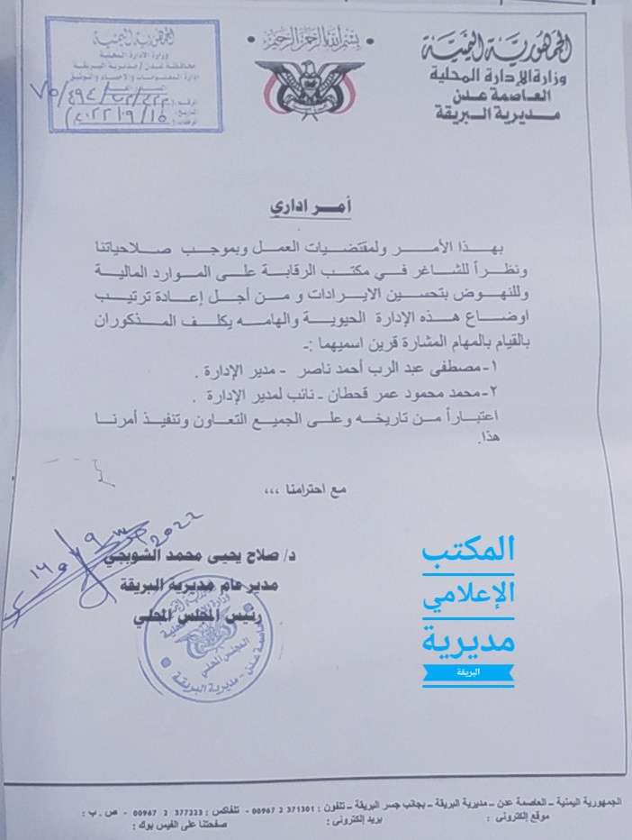 أصدر د/ صلاح يحيى الشوبجي مدير عام البريقة، أمرًا إداريًا قضى بتكليف مديرًا ونائب لإدارة الرقابة على الموارد المالية بالمديرية. نص الأمر الإداري: أمر إداري بهذا الأمر ولمقتضيات العمل وبموجب صلاحياتنا، ونظرًا للشاغر في ( مكتب الرقابة على الموارد المالية ) وللنهوض بتحسين الإيرادات، ومن أجل إعادة ترتيب أوضاع هذه الإدارة الحيوية والهامة يكلف المذكوران بالقيام بالمهام المشارة قرين إسميهما : ١- مصطفى عبد الرب أحمد ناصر - مدير الإدارة ٢- محمد محمود عمر قحطان - نائب لمدير الإدارة اعتبارًا من تاريخه وعلى الجميع التعاون وتنفيذ أمرنا هذا. مع احترامنا.. د/صلاح يحيى محمد الشوبجي مدير عام مديرية البريقة رئيس المجلس المحلي ▪ المكتب الإعلامي - مديرية البريقة - عدن ▪ الخميس - ١٥ سبتمبر ٢٠٢٢م
