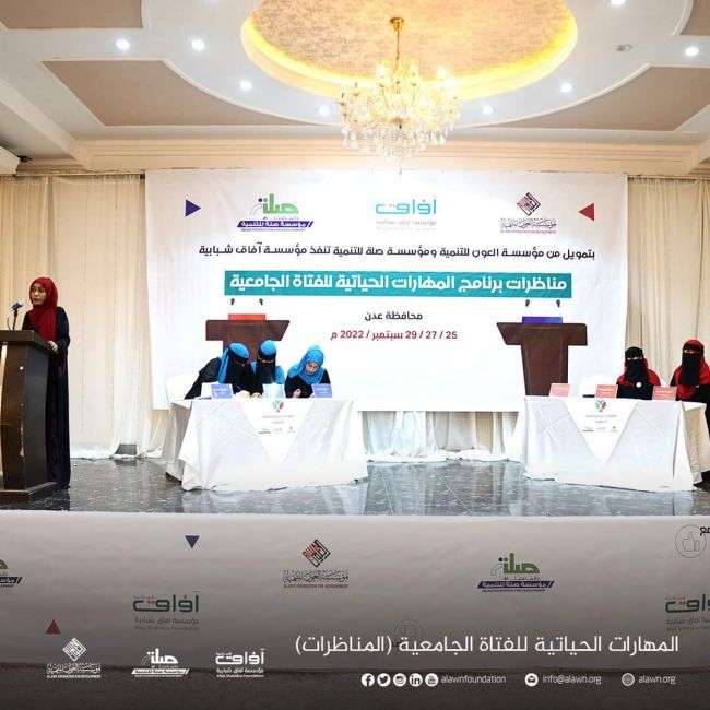 بتمويل من مؤسسة العون للتنمية ومؤسسة صلة للتنمية دشنت مؤسسة آفاق شبابية أولى مناظرات برنامج المهارات الحياتية للفتاة الجامعية بالأطروحة الأولى والتي تحمل عنوان (اختيار التخصص الجامعي يجب أن يكون بناء على الشغف وليس سوق العمل) وفي كلمة د / محمد حمود قاسم - مدير مكتب الشؤون الاجتماعية والعمل - عدن ، أكد فيها على الدور المجتمعي الذي تقدمه منظمات المجتمع المدني وكذا البرامج التي تهتم بالشباب الجامعي وصقل مهارتهم ودمجهم في سوق العمل مؤكداً على أهمية مثل هذه البرامج التي تهتم بالتعليم ورفع كفاءة الطلاب الجامعيين خلال الفعالية تم استعراض الدراسة التي عملت عليها الطالبات خلال الفترة الماضية والتي تحمل عنوان ( آثار استراتيجيات وطرق التدريس على مستوى تحصيل الطلاب للمرحلة الابتدائية ) كما قدُمت مناظرة حية تحت عنوان ( اختيار التخصص الجامعي يجب أن يكون بناء على الشغف وليس سوق العمل ) حيث قدّم فريق الموالاة الحجج والبراهين للأطروحة بينما حاول فريق المعارضة اقناع الجمهور ودحض الحجج وتفنيدها خلال الفعالية تم التصويت للأطروحة قبل بدء المناظرة من قبل الجمهور الحاضر ( الجمهور المؤيد للأطروحة 60 نقطة ) و ( الجمهور المعارض للأطروحة 41 ) وبعد تنفيذ المناظرة ومحاولة كل فريق طرح الحجج ومحاولة اقناع الجمهور ، كان التصويت على النحو التالي ( فريق الموالاة حصل على 53 نقطة ) وحصل فريق المعارضة على ( 43 ) بعد أداء مميز من قبل الفريقين ، وفي ختام الفعالية تم إعلان الفريق الفائز بقرار لجنة التحكيم وتصويت الجمهور حيث تفوق الفريق المؤيد للأطروحة بتصويت الجمهور وتقييم اللجنة ، وتعتبر هذه المناظرة الأولى ضمن مناظرات برنامج المهارات الحياتية للفتاة الجامعية وتتبقى هناك مناظرتين حية تحمل مواضيع مختلفة تنفذ خلال يومي الثلاثاء والخميس القادم "27 - 29 " سبتمبر من العام الجاري.