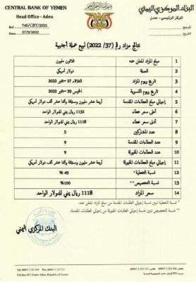 البنك المركزي اليمني يعلن عن نتائج المزاد رقم (37-2022) لبيع عملة أجنبية