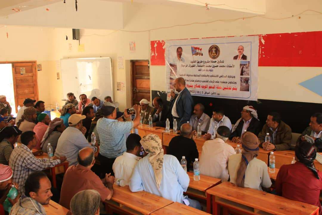 دشن في عاصمة مديرية الشعيب اليوم الاثنين في قاعة ثانوية الشهيد العبادي بعاصمة المديريه فعالية افتتاح مشروع طريق الفقيد الراحل الاستاذ محمد حسين محمد ( الصلئة _ القهرة _ الرحبة ) التي تربط القرى المذكورة بعاصمة المديرية برعاية السلطة المحلية والمجلس الانتقالي بالشعيب وبدعم سخي من رجالات الخير والطيور المهاجرة في الشعيب كان الحفل بحضور مدير عام المديرية الاستاذ حسين حسن عسكر الخيلي والعميد يحى عبيد رئيس انتقالي الشعيب وبحضور جمع غفير من مواطنين القرى المذكورة ومن أبناء الشعيب قاطبة. ،بدأ الحفل بآي من الذكر الحكيم ثم النشيد الوطني الجنوبي ثم كلمة اللجنة التحضيرية للمشروع ألقاها رئيس اللجنة عضو المجلس المحلي بالمركز الانتخابي الاستاذ صالح المشرقي أمين عام المجلس المحلي بالشعيب شكر فيها الحضور وتفاعلهم مع هذا المنجز التاريخي الذي يعتبر الطريق الثاني الشعيب إلى عاصمة المحافظة وما يعانيه المواطنين في هذه القرى من وعورة هذه الطريق الذي تربطهم بعاصمة المديرية بسبب مياة الأمطار شاكرا جهود ابنا الشعيب الخيرين في الدعم المحلي لمشاريع المديريه في شتى المجالات وبتفاعل منقطع النظير جنبا إلى جنب مع السلطة المحلية وداعيا الجميع إلى التفاعل مع هذا المشروع الحيوي الهام والتعاون لما فيه المصلحة العامة. ثم كلمة الهيئه التنفيذيه للمجلس الانتقالي الجنوبي بالشعيب القاها العميد يحيى عباد محمد رئيس المجلس الانتقالي بالمديرية دعاء فيها إلى رص الصفوف وتوحيد الرأي والعمل الجماعي في هذا الضرف الذي بعيشه الجنوب. بعدها كلمة السلطة المحلية بالمديرية ألقاها المدير العام الاستاذ حسين حسن عسكر الى التفاعل لدعم هذا المشروع الحيوي الهام مشروع طريق الفقيد محمد حسين هذه الطريق التي تعتبر الثانية الشعيب مستعرضا ما قدمه المغتربون فى الشعيب من تعاون مجتمعي إلى جانب السلطة المحلية أدار الحفل الدكتور المحامي خالد علي مصلح بالشعيب اختتم الحفل بفتح باب التبرع للمشروع والذي حصل تعاون كبير غير معهود وفي تصريح على هامش الفعاليه صرح رئيس اللجنة التحضيرية للمشروع الشيخ خالد علي مصلح وأفاد أن هذه الطريق تربط قرى القهرة والصلئة والرحبة بعاصمة المديريه ويبلغ سكان القرى ما يقارب من ستة آلاف نسمة وهي مركز انتخابي تقع الطريق المذكورة على الجهة الغربية لمديرية الشعيب ويعاني المواطنين من صعوبة ووعورة الطريق بسبب وقوع الطريق على منحدر الجبل ونزول مياة الأمطار داعيا الخيرين من أبناء الشعيب إلى التفاعل مع هذا المشروع كما عودونا بتعاونهم الخيري دائما