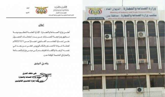 وزارة الصناعة بعدن تعلن بدء امتحانات الحصول على إجازة المحاسب الـقـانـوني