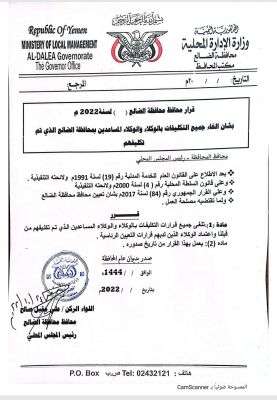 محافظ الضالع يلغي قرارا سابقا بخصوص تكليف الوكلاء ويستثني المعينين بقرار من الرئاسة