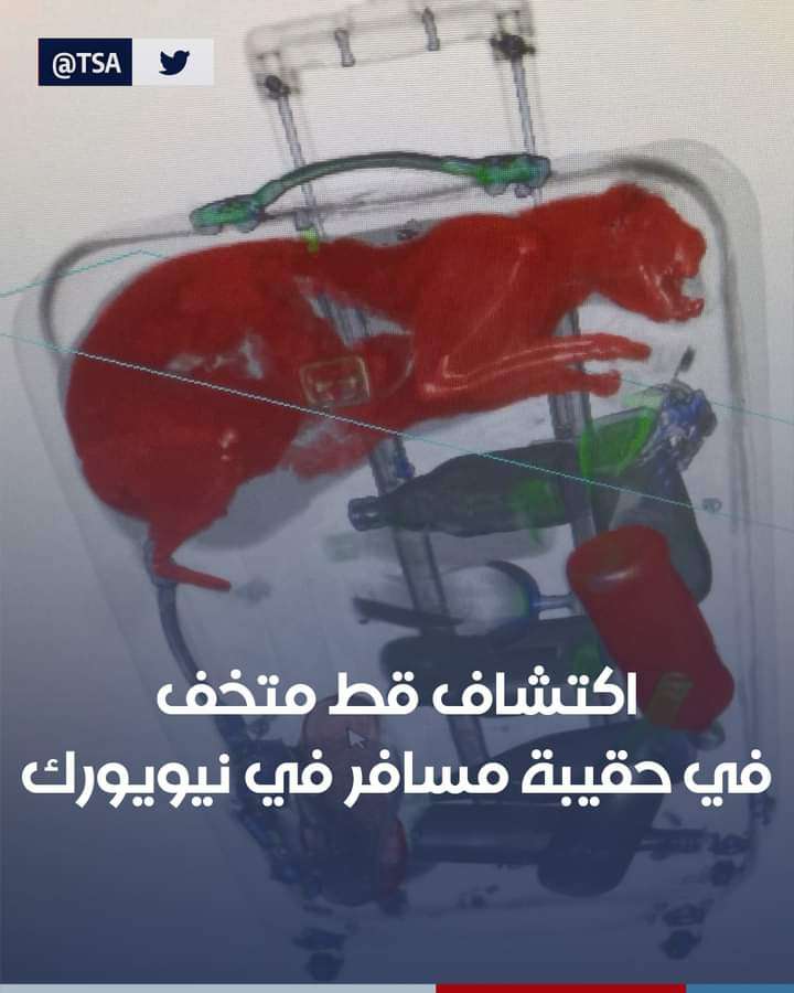 أحبطت إدارة أمن المواصلات الأميركية، محاولة قط لتهريب نفسه من# نيويورك إلى فلوريدا في رحلة مجانية، في وقت سابق من هذا الشهر، بمطار جون إف كينيدي. وكلاء إدارة أمن المواصلات اكتشفوا وجود القط بينما كانت الأمتعة تمر عبر جهاز الأشعة السينية، فيما قال المسافر الذي تفاجأ بوجود القط في حقيبته أنه يخص شخصا آخر في منزله، ويبدو أنه تسلل إلى الحقيبة دون أن يلاحظ أحد. وأدت مغامرة القط "سميلز" إلى تفويت المسافر لرحلته كي يعيده إلى المنزل، واستطاع حجز رحلته في اليوم التالي، ولحسن الحظ بدا القط سليما وغير منزعج من التجربة. وقالت المتحدثة باسم إدارة أمن المواصلات، ليزا فاربستين لشبكة "سي إن إن" إنه "من النادر اكتشاف حيوان حي في حقيبة مسجلة".