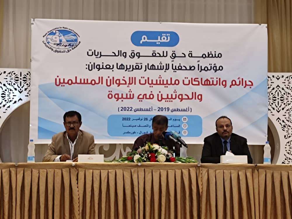 منظمة حق تشهر تقريرها" جرائم وانتهاكات مليشيات الإخوان المسلمين والحوثيين في شبوة ( أغسطس 2019 - أغسطس 2022 )