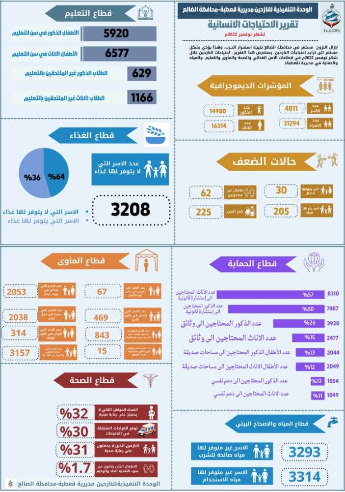دعت الوحدة التنفيذية لادراة مخيمات النازحين بمديرية قعطبة بمحافظة الضالع المنظمات الدولية الى تقديم المساعدات الانسانية للنازحين في المديرية وعلى وجه الخصوص في قطاع الامن الغذائي. وحسب تقرير الاحتياجات الانسانية لشهر نوفمبر2022م قالت الوحدة التنفيذية ان (3208 )اسرة نازحة تواجه خطر المجاعة بقعطبة. وبلغت عدد الاسر النازحة في مديرية قعطبة في محافظة الضالع اكثر من 4811 اسرة نازحة في المخيمات والتجمعات السكانية بحسب التقرير الصادر عن الوحدة التنفيذية للنازحين بالمديرية حيث لازالت مديرية قعطبة تستقبل عشرات الاسر النازحة . وادى تزايد عدد الاسر النازحة الى مديرية قعطبة الى زيادة معاناة النازحين. وتزايد احتياجات النازحين نتيجة الحرب المستمرة في اطراف المحافظة ومدن يمنية عدة . حيث يواجه النازحون تحديات كثيرة في الامن الغذائي والمياة والاصحاح البيئي والمأوى والتعليم والصحة والحماية بحسب تقرير الاحتياجات الانسانية الصادر عن الوحدة التنفيذية للنازحين بمديرية قعطبة لشهر نوفمبر 2022. وبحسب التقرير فان هناك اكثر من 3208 اسرة نازحة تواجه خطر المجاعة لايتوفر لها غذاء و2038 اسرة بحاجة الى دفع ايجارات منازلها 3293 اسرة غير متوفرلها مياة صالحة للشرب، فيما ان(3157) اسرة بحاجة الى مواد غير غذائية. ويستعرض هذا التقرير احتياجات النازحين خلال شهر نوفمبر 2022م لمديرية قعطبة بمحافظة الضالع.