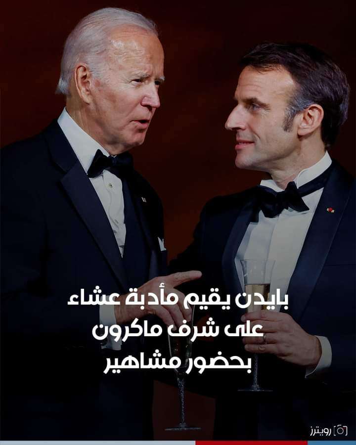 الرئيس الأميركي، #جو_بايدن، يقيم مأدبة عشاء رسمية على شرف الرئيس الفرنسي، #إيمانويل_ماكرون، في البيت الأبيض، بحضور مجموعة من المشاهير وأعضاء الكونغرس وعمالقة عالم الأعمال.