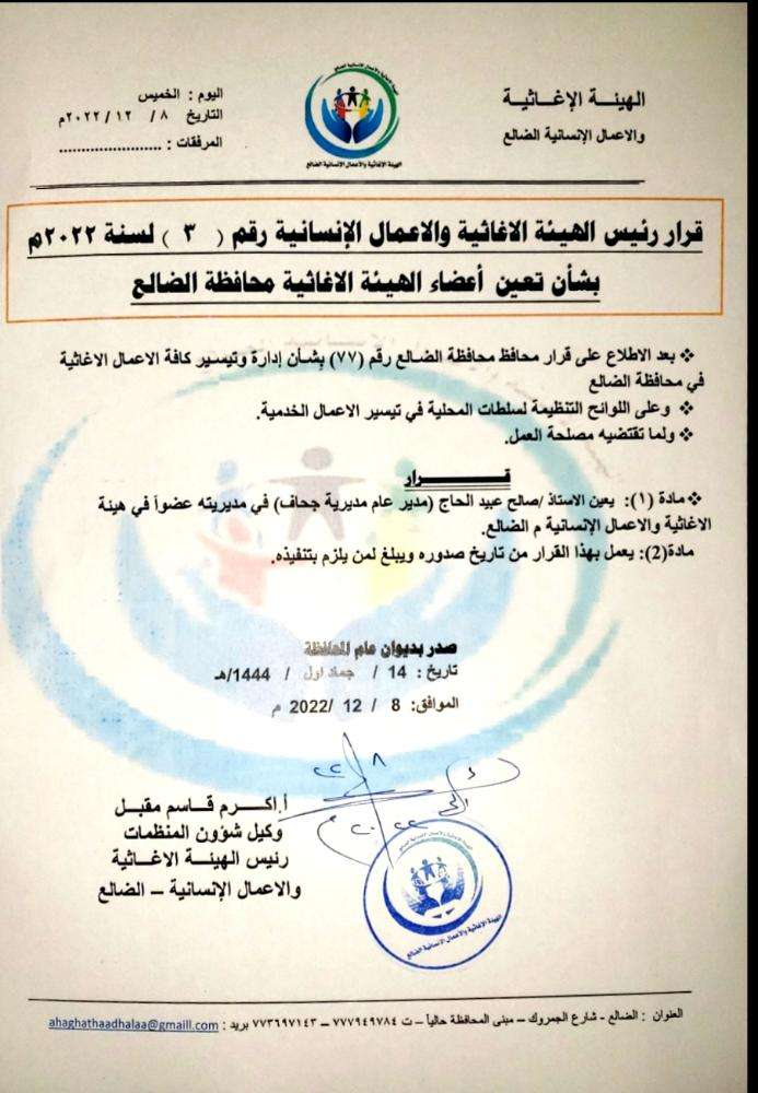 اصدر وكيل شؤون المنظمات رئيس الهيئة الاغاثية والاعمال الانسانية بمحافظة الضالع الاستاذ اكرم قاسم مقبل قرار رقم 3 لسنة 2022 م بتعيين مديرعام جحاف عضو بالهيئة الاغاثية بمحافظةالضالع . ونص القرار بعدالاطلاع على قرار محافظ الضالع رقم 77 بشان ادارة وتيسير كافة الاعمال الاغاثية بمحافظة الضالع وعلى اللوائح التنظيمية لسلطات المحلية ولماتقتضية مصلحة العمل . المادة رقم واحد يعين الاستاذ صالح عبيدالحاج مديرعام مديرية جحاف عضوافي الهيئة الاغاثية والاعمال الانسانية م الضالع ونصت المادة الثانية من القرار بالعمل به من تاريخ صدورة ويبلغ لمن يلزم بتنفيذة صدربديوان عام المحافظة بتاريخ 8 ديسمبر 2022 م حيث اكد رئيس الهيئة الاغاثية بان قرارات تعيين اعضاءللهيئة الاغاثية كان بالتنسيق والموافقة المسبقة من قبل محافظ الضالع والتشاور مع جميع الاعضاء المعينين وان العمل تكاملي بين الجميع من اجل خدمة ابناء محافظة الضالع