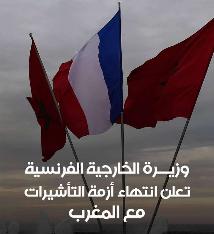 وزيرة الخارجية الفرنسية، كاترين كولونا، تعلن انتهاء أزمة التأشيرات التي عكّرت العلاقات الدبلوماسية بين المغرب وفرنسا منذ أكثر من عام. كولونا، التي تقوم بزيارة رسمية إلى #الرباط، قالت في مؤتمر صحفي مشترك مع نظيرها المغربي، ناصر بوريطة، عقب مباحثات بينهما، "اتخذنا إجراءات، مع شركائنا المغاربة لإعادة علاقات قنصلية طبيعية في ميدان الهجرة"، موضحة أن هذا القرار دخل حيز التنفيذ الاثنين الماضي.