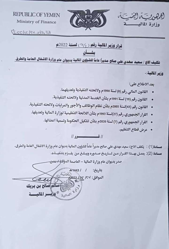 بعثت السلطة المحلية بمديرية رضوم محافظة شبوة أجمل التهاني والتبريكات للأستاذ/ سعيد مهدي علي الحسيني بمناسبة تعيينه مديراً عاماً للشؤون المالية بديوان عام وزارة الاشغال العامة والطرق بموجب قرار معالي وزير المالية الأستاذ/سالم صالح بن بريك رقم (٩٤) لسنة ٢٠٢٢م. واشادت سلطة مديرية رضوم بهكذا قرار كون الحسيني يعتبر من الكوادر المالية والادارية علئ مستوئ الوطن والجدير ذكره أن الحسيني قدتبؤا عدداً من المناصب الادارية والمالية في عدد من المحافظات وكما تمنت سلطة رضوم التوفيق والنجاح للأستاذ سعيد الحسيني ومزيدا من التقدم والنجاح في مهام عملة الجديد السلطة المحلية رضوم محافظة شبوة عنهم : هادي سعيد الخرماء مديرعام مديرية رضوم محافظة شبوة