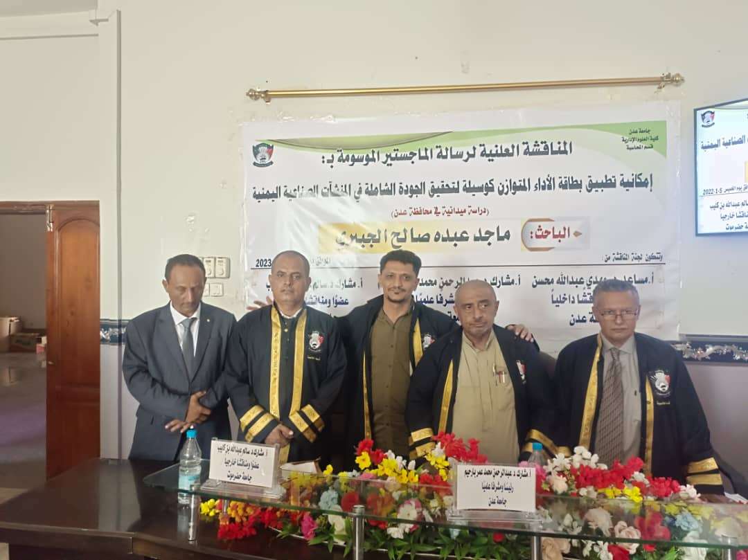 منحت كلية العلوم الادارية جامعة عدن صباح اليوم الخميس درجة الماجستير بامتياز للباحث ماجد عبده صالح الجبيري عن رسالته الموسومه ب ( امكانية تطبيق بطاقة الأداء المتوازن كوسيلة لتحقيق الجودة الشاملة في المنشأت الصناعية في العاصمة عدن) دراسة ميدانية . هذا وقد قدم الباحث دفاعه عن رسالته أمام اللجنة المكونة من الدكتور / أ. مشارك عبد الرحمن محمد عمر با رحيم رئيساً ومشرفاً علمياً والدكتور أ. مشارك سالم عبد الله بن كليب مناقشاً خارجياً من جامعة حضرموت والدكتور أ. مساعد مهدي عبد الله محسن مناقشاً داخلياً . ومنحت اللجنة الباحث درجة الماجستير بتقدير عام امتياز . حضر المناقشة الدكتور فضل علي سالم عميد كلية المجتمع عدن والدكتور صالح عمرو الجريري مدير عام شركة النفط اليمنية عدن والدكتور ياسر باسردة عميد كلية العلوم الادارية ، والدكتور مازن عبد الله فاضل نائب عميد كلية العلوم الادارية الدراسات العليا والدكتورة خلود عبد الوهاب رئيس قسم المحاسبة في كلية العلوم الادارية والاستاذ امجد زيد ثابت والاعلامي الأستاذ وليد الجعشاني وعدد من زملاء واصدقاء الباحث .