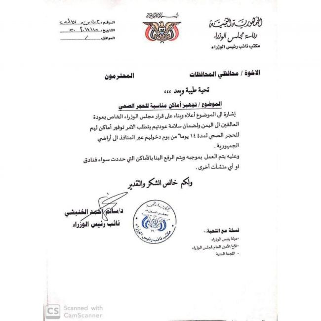 حيث جاء في الوثيقة التي اصدرها نائب رئيس الوزراء سالم الخنبشي : "بناء على قرار مجلس الوزراء الخاص بعودة العالقين الى اليمن ولضمان سلامة عودتهم يتطلب الامر توفير أماكن لهن للحجر الصحي لمدة 14 يوما، من يوم دخولهم عبر المنافذ الى أراضي الجمهورية. وعليه يتم العمل بموجبه ويتم الرفع الينا بالاماكن التي حددت سواء فنادق او اي منشآت اخرى"