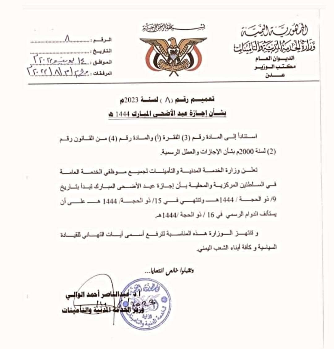 وزارة الخدمة المدنية تعلن 9 ذو الحجة بدء إجازة عيد الاضحى المبارك عدن