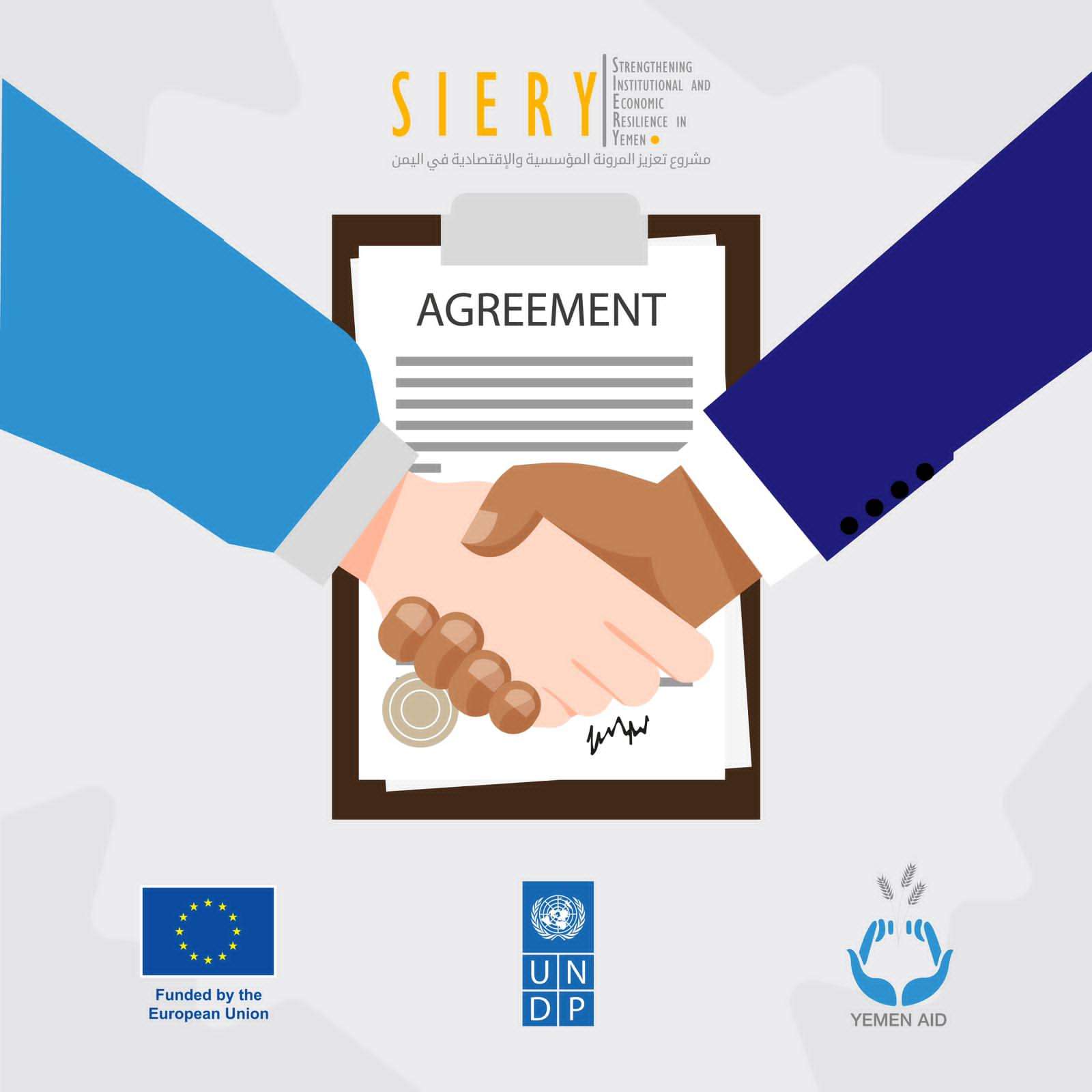 وقعت منظمة "يمن أيد" اتفاقية تنفيذ برنامج تعزيز المرونة المؤسسية والاقتصادية في اليمن "SIERY" مع برنامج الأمم المتحدة الإنمائي "UNDP" بدعم من الاتحاد الأوربي. ويهدف البرنامج إلى رفع مستوى البنى التحتية في محافظتي عدن ولحج، من خلال تنفيذ خمسة عشر مشروعًا حيويًا لتحسين قدرات مقدمي الخدمات وتوسيع نطاق الوصول إلى الفئات الأكثر ضعفًا للتخفيف من أعبائهم. ويستهدف البرنامج المقرر تنفيذه خلال 6 أشهر 10 مديريات من خلال تنفيذ 15مشروعًا متعددًا في مجالات البنى التحتية، المياه والصرف الصحي، التعليم، الصحة، الأشغال العامة والطرق، لرفع قدراتها وتوسيع خدماتها المقدمة للمواطنين.