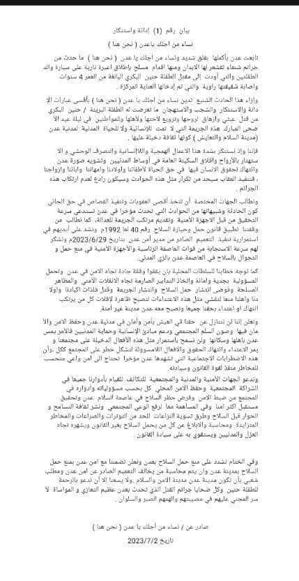 أصدرت نساء من أجلك يا عدن صباح اليوم بيان إدانة واستنكار حول منع ظاهرة حمل السلاح في العاصمة عدن نساء من اجلك يا عدن ( نحن هنا ) تابعت عدن بأكملها يقلق شديد ونساء من اجلك يا عدن ( نحن هنا ) ما حدث من جرائم شنعاء تقشعر لها الابدان ومنها اقدام مسلح بإطلاق أعيرة نارية على سيارة والد الطفلتين والتي أودت إلى مقتل الطفلة حنين البكري البالغة من العمر 4 سنوات وإصابة شقيقتها راوية والتي تم إدخالها العناية المركزة . وإزاء هذا الحادث الشنيع تدين نساء من اجلك يا على ( نحن هنا ) باقسي عبارات الا دالة والاستنكار والشجب والاستهجان ما تعرضت له الطفلة البرينة / حنين البكري من قتل عيني وازهاق روحها وترويع لاختها ولأهلها والمواطنين في ليلة عيد الاضحى المبارك هذه الجريمة التي لا تمت للإنسانية ولا للحياة المدنية المدنية عدن (مدينة السلام والتعايش ) كونها تعاقة دخيلة عليها . فإننا وإذا استنكر بشدة هذا الاعمال الهمجية واللاإنسانية والتصرف الوحشي والا ستهتار بالأرواح وافلاق المكينة العامة في أوساط المدنيين وتشويه صورة عدن وانتهاك لحقوق الانسان فيها في حق الحياة لأطفالنا واولادنا وأمهاتنا واياتنا وازواجنا لتقيد العقاب ميحد من تكرار مثل هذه الحوادث وسيكون رادع لعدم ارتكاب هذه الجرائم. وتطالب الجهات المختصة أن اتخذ القصى العقوبات وتنفيذ القصاص في حق الجاني كون الحادثة وشبيهاتها من الحوادث التي تحدث مؤخرا في عدن الستدعي سرعة التحقيق من قبل الاجهزة الأمنية وتقديم مرتكب الجريمة للعدالة، كما تطالب من وقفتنا تطبيق القانون حمل وحيازة السلاح رقم 40 لما 1992م وتشد على أيديهم في استمرارية تنفيذ التعميم الصادر من مدير أمن عدن بتاريخ 2023/6/29م ولشكر لهم سرعة الاستجابة من قوات العاصفة الرئاسية والأجهزة الأمنية في منع حمل و التجوال بالسلاح في العاصمة عدن بالزي المدني. كما توجه خطابا للسلطات المحلية بأن يقفوا وقفة جادة تجاه الأمن في عدن وتحمل المسؤولية بجدية وامانه واتخاذ التدابير الصارمة تجاه الانفلات الأمني والمظاهر المسلحة وفوضى انتشار حمل السلاح والنشار الجريمة وقتل فلذات اكبادنا وأولا دنا واهلنا منها لتفشي مثل هذه الاعتداءات لتصبح ظاهرة لإفلات كل من يرتكب انتهاك او اعتداء بحقنا جميعا والصبح معد عدن مدينة غير أمنة. وتعلن إنها أن تتنازل عن حقنا في العيش بأمن وأمان في مدنية عدن وحفظ الأمن والا مان فيها وصون السلم المجتمعي ودعم مبادئ الإنسانية وحماية المدنيين فالأمر يعني عدن باهلها وسكانها ولن تسمح باستمرار مثل هذه الأفعال الدخيلة على مجتمعنا و يمر الاعتداء وانتهاك الحقوق والافعال اللاسوولة لتشكل خطر على المجتمع ككل وأن هذه الاضطرابات الاجتماعية التي تشهدها عدن مؤخرا تحتاج إلى أمن واعي متحسب المخاطر منقذ للقوة القانون وسيادته. وتدعو الجهات الأمنية والمدنية والمجتماعية للتكاتف للقيام بأدوارنا جميعا في الشراكة المجتمعية وحفظ الامن المحلي كل بحسب مسؤولياته وأدواره في المجتمع من ضبط الامن وفرض حظر السلاح في عاصمة السلام عدن وتحقيق مستقبل أكثر أمنا وفي المساهمة معنا لرفع الوعي المجتمعي ونشر ثقافة السامع و الحوار قبل السلاح وطرق تسوية النزاعات الحد من التوترات والصراعات والمخاطر المتزايدة ومحاسبة والإبلاغ عن كل من يحمل السلاح بغير القانون ويشهره تجاه العزل والمدنيين ويستالوي به على سيادة القانون. وفي الختام تشدد على منع حمل السلاح بعدن وتعلن تضعتنا مع امن عمن يمنع حمل السلاح بمدينة عدن وأن يتم محاسبة من يخالف التعميم الصادر عن أمن عدن ومطلب شعبي بأن تكون مدينة عدن مدينة الامن والسلام ولا يسعنا إلا أن تدعو بالرحمة الطفلة حنين وكل ضحايا جرائم القتل الذي تحدث بعدن عظيم التعازي و المواساة لا مر المجني عليهم في مصيبتهم والهمهم الصبر والسلوان. صادر عن / نساء من أجلك يا عدن ( نحن هنا ) تاريخ 2023/7/2