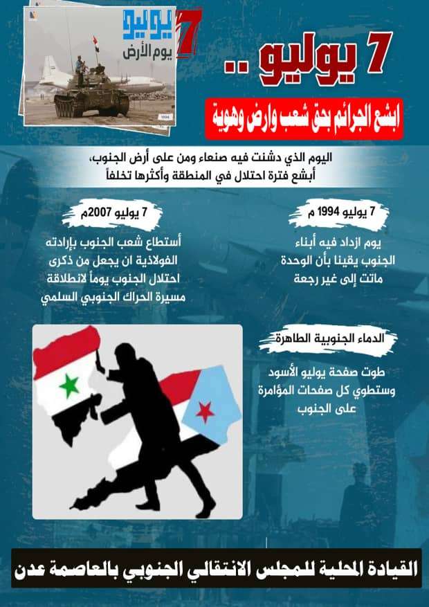 احيت القيادة المحلية للمجلس الانتقالي الجنوبي في العاصمة عدن، اليوم الجمعة، ذكرى "يوم الارض الجنوبي" والذي يصادف الذكرى الـ 29 لاحتلال الجنوب يوم 7 يوليو عام 1994 من قبل قوات العربية اليمنية. وقامت القيادات المحلية للمجلس بمديريات العاصمة عدن بتجديد ورفع علم الجنوب اعلى المرافق والمؤسسات وفي الشوارع والاماكن العامة. كما تم خلال ذلك توزيع العديد من الملصقات بهذه الذكرى والتي احتوت نبذه تعريفية عن مخطط قوى الشمال وما قام به نظام صنعاء من استهداف وتدمير ممنهج للجنوب ارض وانسانا. هذا واكدت قيادة انتقالي العاصمة، وهي تحيي ذكرى احتلال الجنوب العام 1994م، على السير قدما خلف القيادة الجنوببة برئاسة الرئيس القائد عيدروس قاسم الزُبيدي، لتحقيق كافة اهداف وتطلعات شعب الجنوب المتمثلة باستعادة دولته الفدرالية حرة مستقلة من حوف شرقا حتى باب المندب غربا.