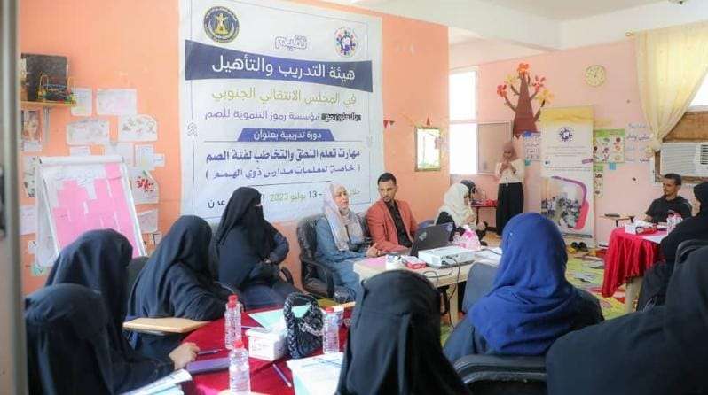 أقامت هيئة التدريب والتأهيل في المجلس الانتقالي الجنوبي بالتعاون مع مؤسسة رموز التنموية للصم والبكم، اليوم الأحد، في العاصمة عدن، دورة تدريبية بعنوان" مهارات تعلم النطق والتخاطب لفئة الصم والبكم" خاصة لمعلمات مدارس ذوي الهمم. وألقت الدكتورة منى عوض باشراحيل رئيس هيئة التدريب والتأهيل والتدريب، كلمة أشارت فيها بأن الهيئة تسير في إطار خطة تشمل الكثير من التواصل والعمل مع منظمات المجتمع المدني وخاصة المؤسسات التي تهتم بالطفل والطفولة. واضافت باشراحيل بأن الدورة التدريبية جاءت بعد توجيهات القيادة في المجلس الانتقالي ممثلة برئاسة عيدروس قاسم الزُبيدي بضرورة بذل الجهد والتواصل مع الاخوات في رئاسة هذه المؤسسات لمعرفة احتياجاتهم من أجل مواكبة التطور الحديث للعلم الذي ينمو سنة بعد أخرى. واكدت باشراحيل على العمل من أجل دمج الطفل مع الأسرة والمجتمع والدخول في المدارس العامة والمؤسسات لرفع قدرات ومهارات المعلمين والمعلمات لتأدية عملهم مع الأطفال ذوي الهمم من الصم والبكم. ومن جانبها، أشارت الأستاذة أيمان عمر هاشم المدير التنفيذي لمؤسسة رموز التنموية للصم إلى أن الدورة التدريبية شاركت فيها جمعية الاحتياجات وجمعية المعاقين حركيٱ، والتي تسعى لرفع قدرات وإمكانيات المعلمين في العاصمة عدن وتدريب الأطفال ذوي الاحتياجات الخاصة لرفع قدراتهم في التخاطب معهم. الجدير بالذكر بأن الدورة التي تشارك فيها 25 معلمة في الجمعيات الخاصة بالصم والبكم، ستستمر خمسة أيام متتالية.