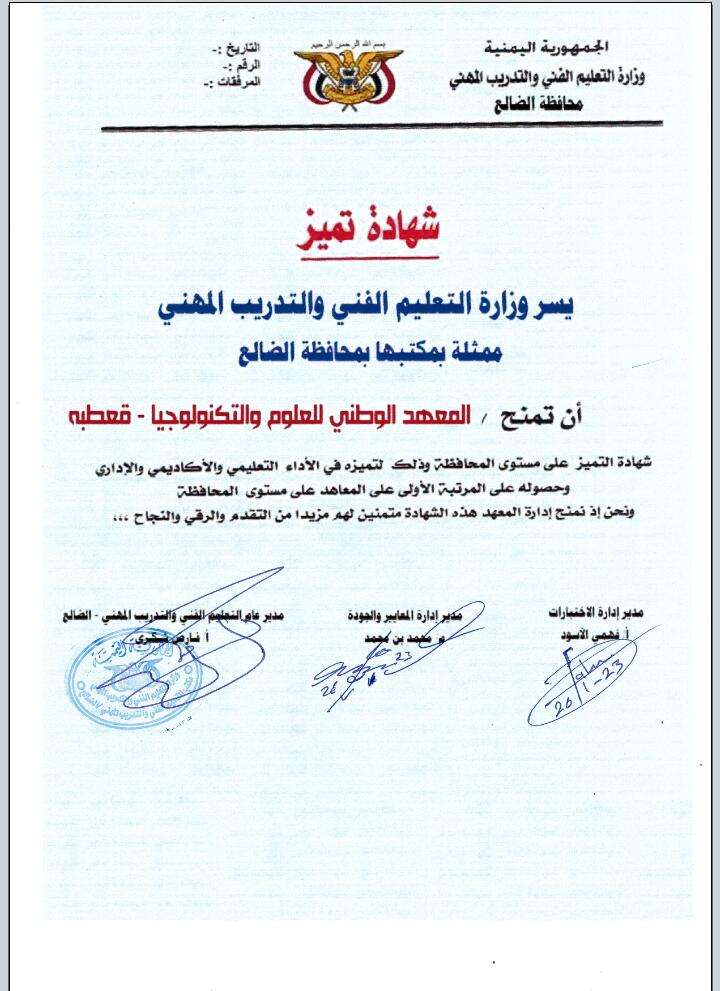 وزارة التعليم الفني تمنح المعهد الوطني للعلوم والتكنولوجيا المرتبة الأولى وشهادة تميز على معاهد محافظة الضالع.