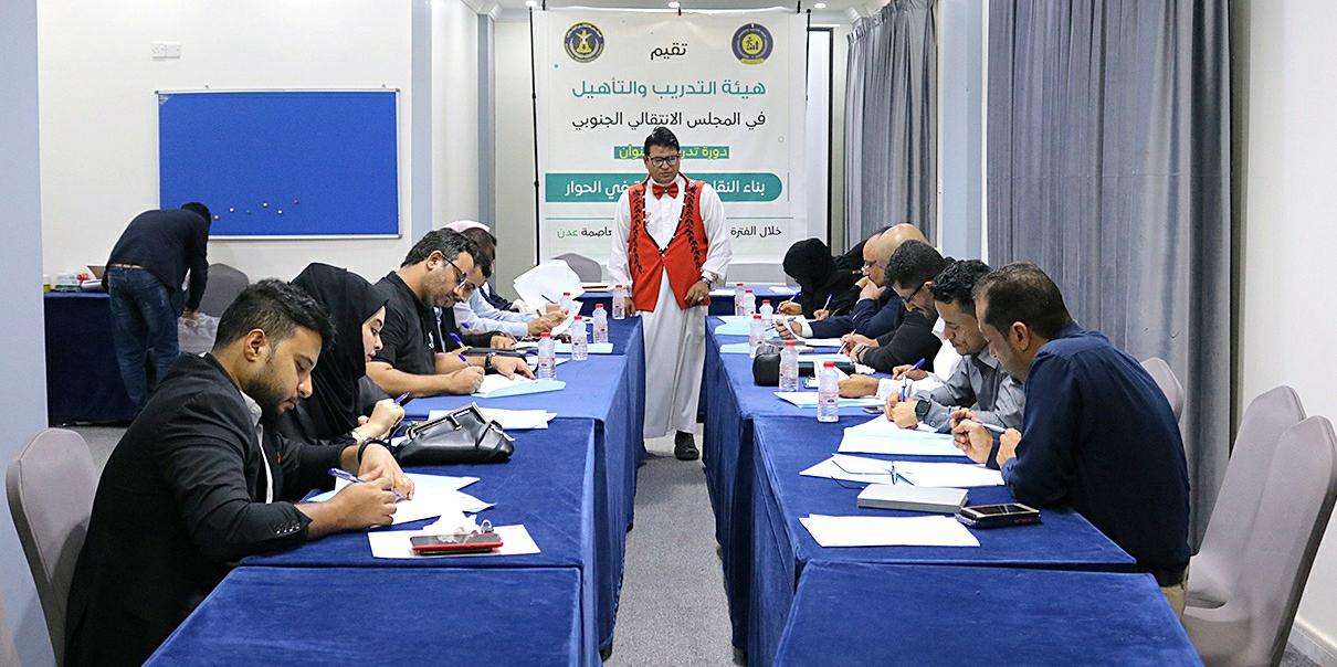 أقامت هيئة التدريب والتأهيل بالمجلس الانتقالي الجنوبي، اليوم الأحد، بالعاصمة عدن، دورة تدريبية بعنوان "بناء النقاط المشتركة في الحوار". وفي مستهل الدورة رحب الاستاذ ناصر أحمد، مدير العلاقات العامة في الهيئة، بالمشاركين، ناقلا لهم تحايا رئيس هيئة التدريب والتأهيل الدكتورة منى با شراحيل، ومتمنيا لهم التوفيق والاستفادة من الدورة. وتضمنت الجلسة الأولى من الدورة التي يقدمها، الأستاذ ميعاد جُمّن، استشاري هيئة التدريب والتأهيل، نشاط افتتاحي، حول التوقعات والتقييم وعرض الأهداف وبرنامج وقواعد وتعليمات الدورة. وتلقى المشاركون في الجلسة الثانية للدورة التي ستستمر لخمسة أيام، شرحا حول نوعية الحوار وآثاره في التعامل مع الآخرين، وعرض نموذج مثالي للحوار، وآداب الحوار النفسية والآداب العلمية واللفظية، وكذا تعريف مفهوم الحوار وأشكاله.
