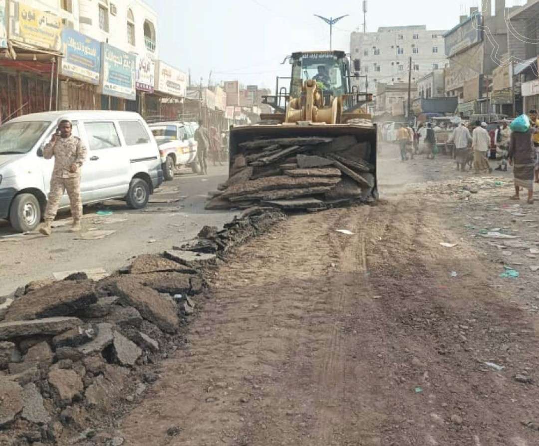 بدء أعمال صيانة وإعادة تأهيل الشارع الرئيسي والخلفي لمدينة الحبيلين في لحج