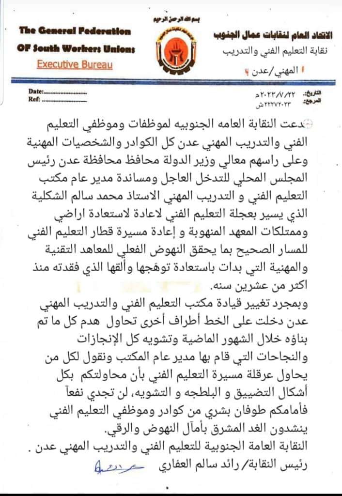 النقابة العامة الجنوبية للتعليم الفني بالعاصمة عدن ترد على الأبواق المأجورة والموظفون يناشدون المحافظ لملس