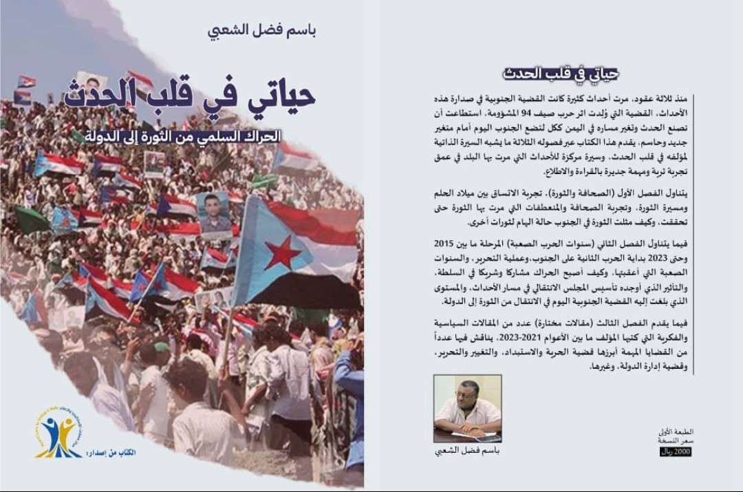 صدر اليوم الأحد في العاصمة عدن، كتاب جديد للصحفي والكاتب والمحلل السياسي باسم فضل الشعبي، وجاء الكتاب في 126 صفحة موزعة على ثلاثة فصول، تناول الفصل الاول (الصحافة والثورة) تجربة المؤلف في الصحافة والثورة " ثورة الحراك السلمي والثورة الشبابية" كيف تشكلت الثورتان والى ماذا الت، مستعرضا عدد من المحطات السياسية التي مرت بها البلد خلال العقود الأخيرة بالنقد والتحليل، وفي الفصل الثاني ( سنوات الحرب الصعبة ) يتناول المؤلف المرحلة ما بين حرب 2015 على الجنوب إلى 2023، ويقدم فيها الكثير من الوقائع والأحداث من موقعه كمشارك في الحدث، مستعرضا علاقاته بالكثير من الشخصيات التي كان لها دور في الأحداث ومنها اللواء عيدروس الزبيدي رئيس المجلس الانتقالي الجنوبي، نائب رئيس مجلس القيادة الرئاسي، واللواء محمود الصبيحي، وقائد مقاومة عدن نايف البكري، واللواء جعفر محمد سعد واخرون، كما يقدم في هذا الفصل شرحا عن السنوات الصعبة التي أعقبت تحرير عدن ومناطق الجنوب المختلفة، والمدى الذي بلغت إليه القضية الجنوبية، ودور المجلس الانتقالي في الأحداث، وفي الفصل الثالث ( مقالات مختارة) يتناول المؤلف عبر مقالات سياسية وفكرية معالجة الكثير من القضايا، منها قضية الحرية والاستبداد، وقضية الدولة، والتحرير والتغيير، والفساد، وغيرها من القضايا الهامة. الكتاب متوفر في مكتبات عدن ( مكتبة 14 اكتوبر الشيخ عثمان بجوار قسم الشرطة القديم، مكتبة الجيل الجديد الشيخ عثمان تحت مسجد النور، مكتبة الكلمة خور مكسر ساحة العروض بحوار معامل رمزي للتصوير، مكتبة خالد بن الوليد كريتر الميدان، مكتبة عبادي كريتر شارع السوق الطويل). ويعتبر هذا الاصدار هو الثاني للزميل الشعبي، حيث أصدر العام 2013 كتابة الاول افكار في الثورة والتغيير.