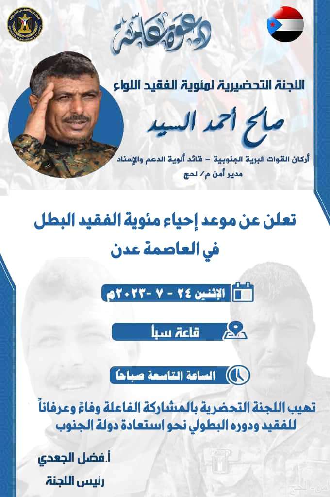 اللجنة التحضيرية لمئوية الفقيد البطل اللواء صالح السيد تعلن موعد إقامتها بعدن